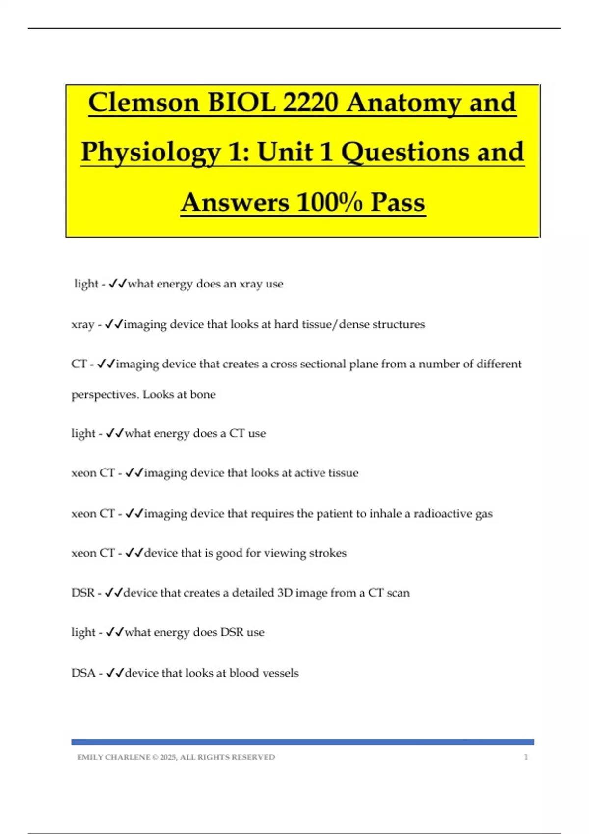 Clemson BIOL 2220 Anatomy and Physiology 1: Unit 1 Questions and Answers 100% Pass light - what energy does an xray use xray - imaging device that looks at hard tissue/dense structures CT - imaging device that creates a cross sectional plane from a number of different perspectives. Looks at bone light - what energy does a CT use xeon CT - imaging device that looks at active tissue xeon CT - imaging device that requires the patient to inhale a radioactive gas xeon CT - device that is good for viewing strokes DSR - device that creates a detailed 3D image from a CT scan light - what energy does DSR use DSA - device that looks at blood vessels EMILY CHARLENE © 2025, ALL RIGHTS RESERVED 2 DSA - device that requires a contrast dye injected into patient to view blood vessels light - what energy does DSA use PET - device that shows metabolic processes PET - device that requires radioactive isotope injections PET - what device is used to determine if a tumor is cancerous or not M2A - - a swallowable pill/imaging capsule (has a mini camera on it) -The pill snaps digital pictures as it passes through the digestive tract light - what energy does PET use ultrasound - imaging device that uses sound waves to work ultrasound - uses high frequency sound waves to look at soft tissue magnetic - what energy does MRI use magnetic - what energy does MRS use MRI - uses magnetic energy to look at soft tissue; creates a magnetic field that makes charged ions in the tissue temporarily line up and creates a p