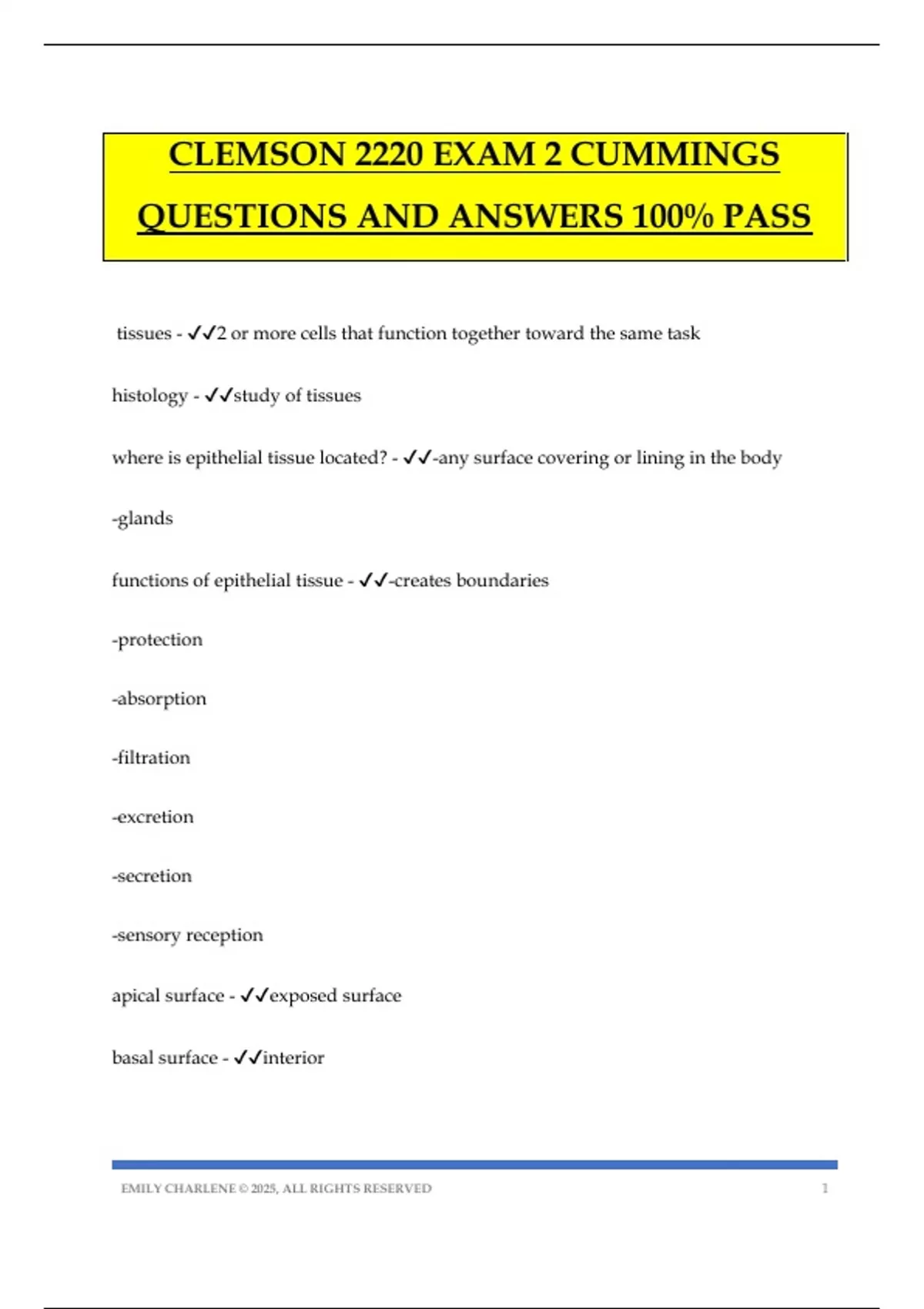 CLEMSON 2220 EXAM 2 CUMMINGS QUESTIONS AND ANSWERS 100% PASS tissues - 2 or more cells that function together toward the same task histology - study of tissues where is epithelial tissue located? - -any surface covering or lining in the body -glands functions of epithelial tissue - -creates boundaries -protection -absorption -filtration -excretion -secretion -sensory reception apical surface - exposed surface basal surface - interior EMILY CHARLENE © 2025, ALL RIGHTS RESERVED 2 away from external -attatched to something underneath basement membrane - 2 parts basal lamina reticular membrane reticular lamina - collagen fiber layer to add strength is epithelium avascular - yup basal lamina - attached to basal layer of epi -adhesive sheet of protein -selective filter how do we classify epithelia? - -# of cell -shape simple - -absorbtion and filtration -not a lot of friction -easily damaged -1 layer of cells stratified - -many cell layers EMILY CHARLENE © 2025, ALL RIGHTS RESERVED 3 -protection -lots of wear and tear pseudo stratified - one layer but looks like multiple -lots of movement -stretches -not much change in shape or size squamous - flat -on apical surface cuboidal - box like -same width and height columnar - taller than they are wide transitional - dome shaped on apical surfac
