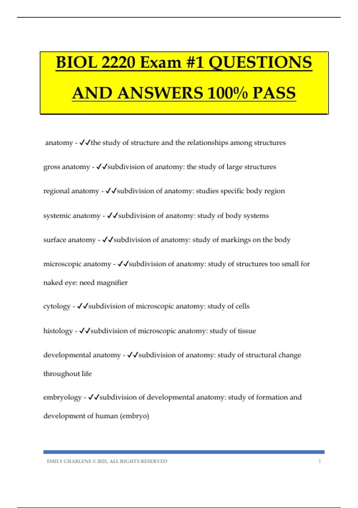 BIOL 2220 Exam #1 QUESTIONS AND ANSWERS 100% PASS anatomy - the study of structure and the relationships among structures gross anatomy - subdivision of anatomy: the study of large structures regional anatomy - subdivision of anatomy: studies specific body region systemic anatomy - subdivision of anatomy: study of body systems surface anatomy - subdivision of anatomy: study of markings on the body microscopic anatomy - subdivision of anatomy: study of structures too small for naked eye: need magnifier cytology - subdivision of microscopic anatomy: study of cells histology - subdivision of microscopic anatomy: study of tissue developmental anatomy - subdivision of anatomy: study of structural change throughout life embryology - subdivision of developmental anatomy: study of formation and development of human (embryo) EMILY CHARLENE © 2025, ALL RIGHTS RESERVED 2 pathological anatomy - subdivision of anatomy: study of changes in structure due to disease radiographic anatomy - subdivision of anatomy: study of structures using x-rays + other scanning technologies x-ray - light energy that creates images of inside of body (bones absorb more=white, fat and tissue absorb less=grey) ct scan - computerized tomography scan: light energy through body, sends signal to computer to create image. more detailed X-ray. xenon ct scan - type of scan enhanced by use of radioactive element that allows image of active tissue DSR scan - Dynamic Spacial Reconstruction: light energy used to produce 3D images DSA - digital subtraction angiography: provides image of blood vessels (shows blood flow) PET Scan - positron emission tomography: uses radiotracers to show metabolic activity ultrasound - imaging test that uses sound waves projected off the body to create an image (not detailed) EMILY CHARLENE © 2025, ALL RIGHTS RESERVED 3 MRI - magnetic resonance imaging: uses magnetic field + radio waves to create detailed image of soft tissues (organs) MRS - magnetic resonance spectroscopy: analyzes chemical makeup of tissue M2A - swallowable pill/imaging capsule (has a mini camera on it) physiology - the study of functions of body parts chemical - level of organization: essentials of life cellular - level of organization: basic functional unit of life tissue - level of organization: group of cells that functi