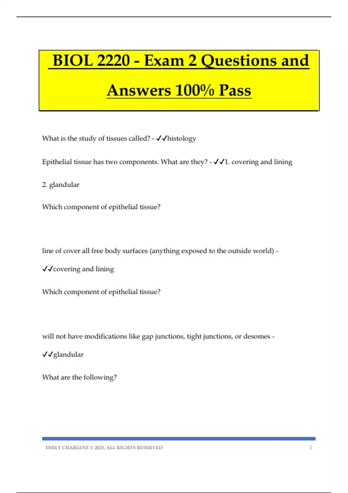 BIOL 2220 - Exam 2 Questions and Answers 100% Pass What is the study of tissues called? - histology Epithelial tissue has two components. What are they? - 1. covering and lining 2. glandular Which component of epithelial tissue? line of cover all free body surfaces (anything exposed to the outside world) - covering and lining Which component of epithelial tissue? will not have modifications like gap junctions, tight junctions, or desomes - glandular What are the following? EMILY CHARLENE © 2025, ALL RIGHTS RESERVED 2 1. establish boundaries 2. protection 3. absorption 4. filtration 5. excretion 6. secretion 7. sensory reception - functions of epithelial tissue Which function of epithelial tissue? separates the inside and the outside - establish boundaries Which function of epithelial tissue? covers body surfaces - protection Which function of epithelial tissue? absorb food that pass the epithelial tissue - absorption Which function of epithelial tissue? EMILY CHARLENE © 2025, ALL RIGHTS RESERVED 3 pass epithelial tissues to leave the body - excretion and secretion Which function of epithelial tissue? modification of epithelial tissue (touch receptors) - sensory reception What two types of boundaries does epithelial tissue have? - 1. apical surface 2. basal surface Which boundary of epithelial tissue? exposed to the air free surface top - apical surface Which boundary of epithelial tissue?