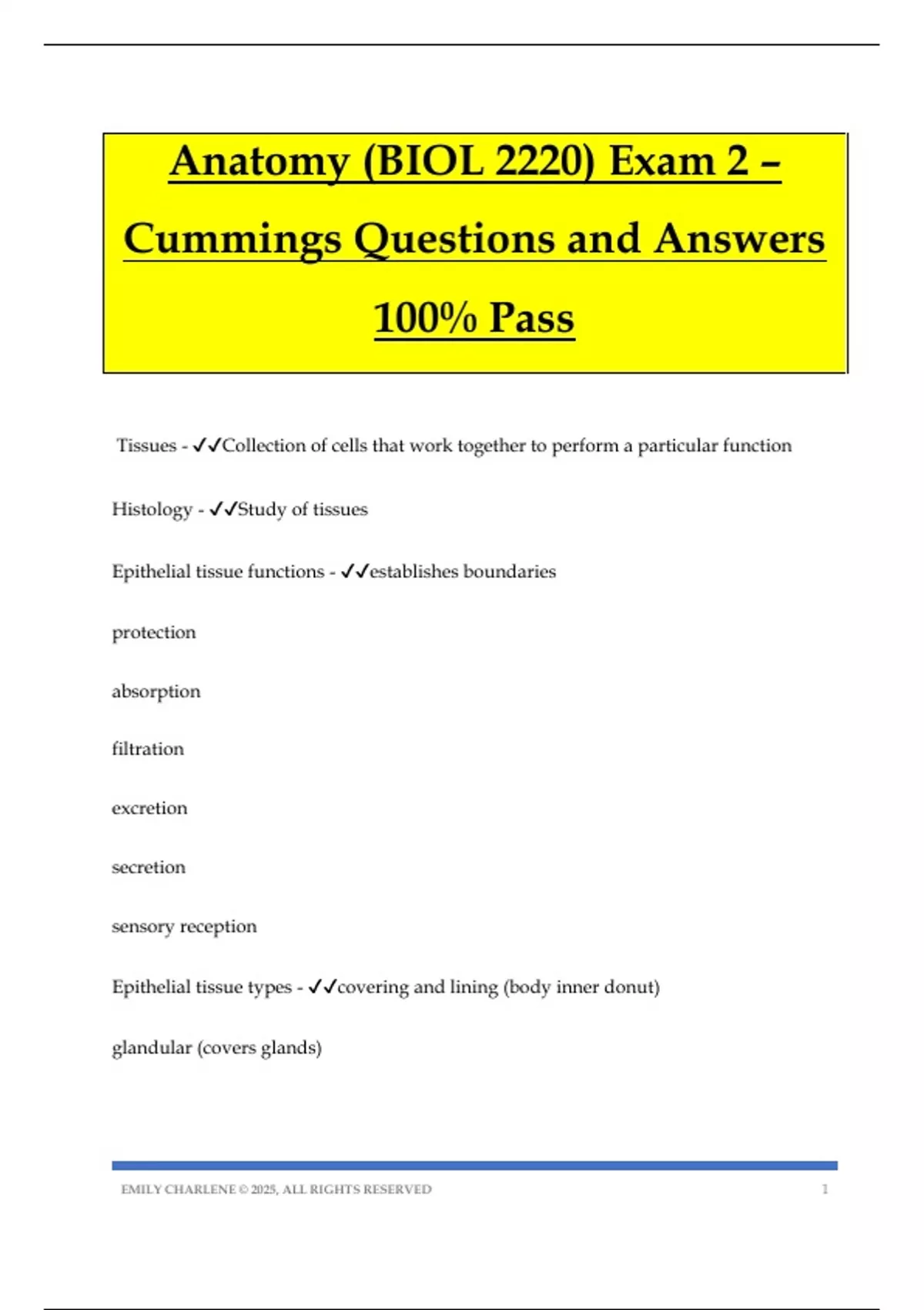 Anatomy (BIOL 2220) Exam 2 – Cummings Questions and Answers 100% Pass Tissues - Collection of cells that work together to perform a particular function Histology - Study of tissues Epithelial tissue functions - establishes boundaries protection absorption filtration excretion secretion sensory reception Epithelial tissue types - covering and lining (body inner donut) glandular (covers glands) EMILY CHARLENE © 2025, ALL RIGHTS RESERVED 2 Epithelial tissue apical surface - upper free surface Epithelial tissue basal surface - deepest layer, below apical layer epithelial tissue basement membrane - basal lamina (right below basal layer) reticular lamina (network of proteins-mostly collagen- that become barrier, deep to basal lamina) Avascular - no blood vessels, blood has to diffuse through covering and lining epithelium types - simple, stratified, pseudostratified, squamous, cuboidal, columnar, transitional simple epithelium - one layer of cells, lots of absorption and filtration stratified epithelium - more than one cell for material to go through pesudeostratified epithelium - one cell layer but looks like more than one, found in areas with little movement squamous epithelium - flat cells cuboidal epithelium - cells have same width as height columnar cells - cells are taller than they are wide transitional - lines hollow cavities like bladder, go from dome cells to flat cells, allows organs to stretch EMILY CHARLENE © 2025, ALL RIGHTS RESERVED 3 glands - secret substances into ducts, blood, or onto surfaces types of glands - exocrine, endocrine, unicellular, multicellular, merocrine, holocrine exocrine glands - secret into channel, then into ducts endocrine glands - secretion into bloodstream (ex: hormones) unicellular glands - goblet cells produce mucus multicellular glands - composed of multiple cells merocrine glands - no destruction of cells during exocytosis holocrine glands - cell accumulates excretory material and then carries it out of tissue and is destroyed to release the material mesenchyme embryonic tissue - connective tissue is