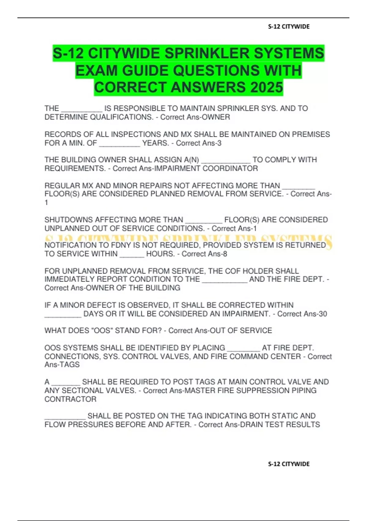 S-12 CITYWIDE SPRINKLER SYSTEMS EXAM GUIDE QUESTIONS WITH CORRECT ANSWERS 2025
