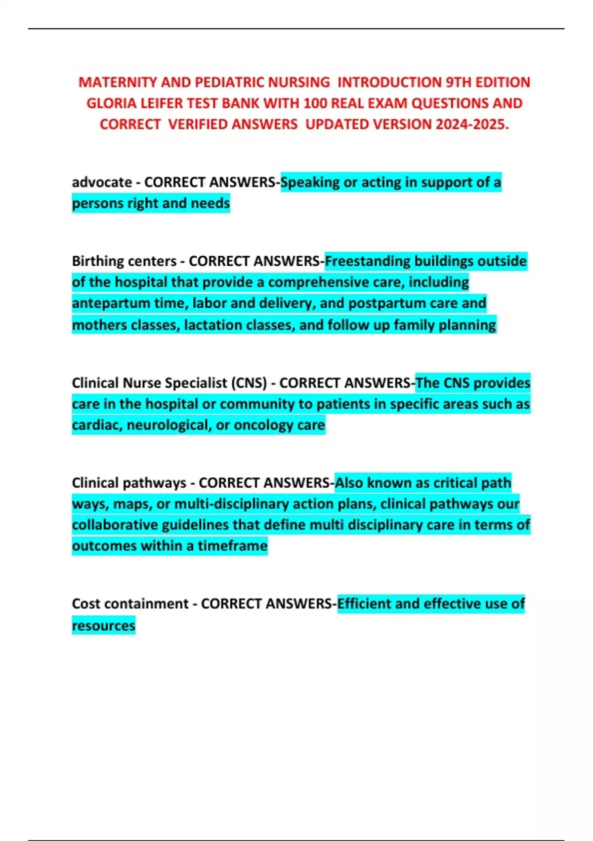 MATERNITY AND PEDIATRIC NURSING INTRODUCTION 9TH EDITION GLORIA LEIFER TEST BANK WITH 100 REAL EXAM QUESTIONS AND CORRECT VERIFIED ANSWERS UPDATED VERSION .