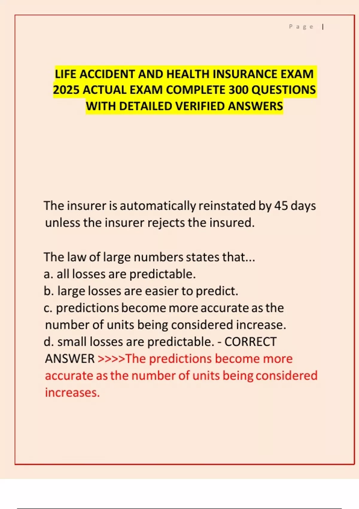 LIFE ACCIDENT AND HEALTH INSURANCE EXAM 2025 ACTUAL EXAM COMPLETE 300 QUESTIONS WITH DETAILED VERIFIED ANSWERS LIFE ACCIDENT AND HEALTH INSURANCE EXAM 2025 ACTUAL EXAM COMPLETE 300 QUESTIONS WITH DETAILED VERIFIED ANSWERS LIFE ACCIDENT AND HEALTH INSURANCE EXAM 2025 ACTUAL EXAM COMPLETE 300 QUESTIONS WITH DETAILED VERIFIED ANSWERS