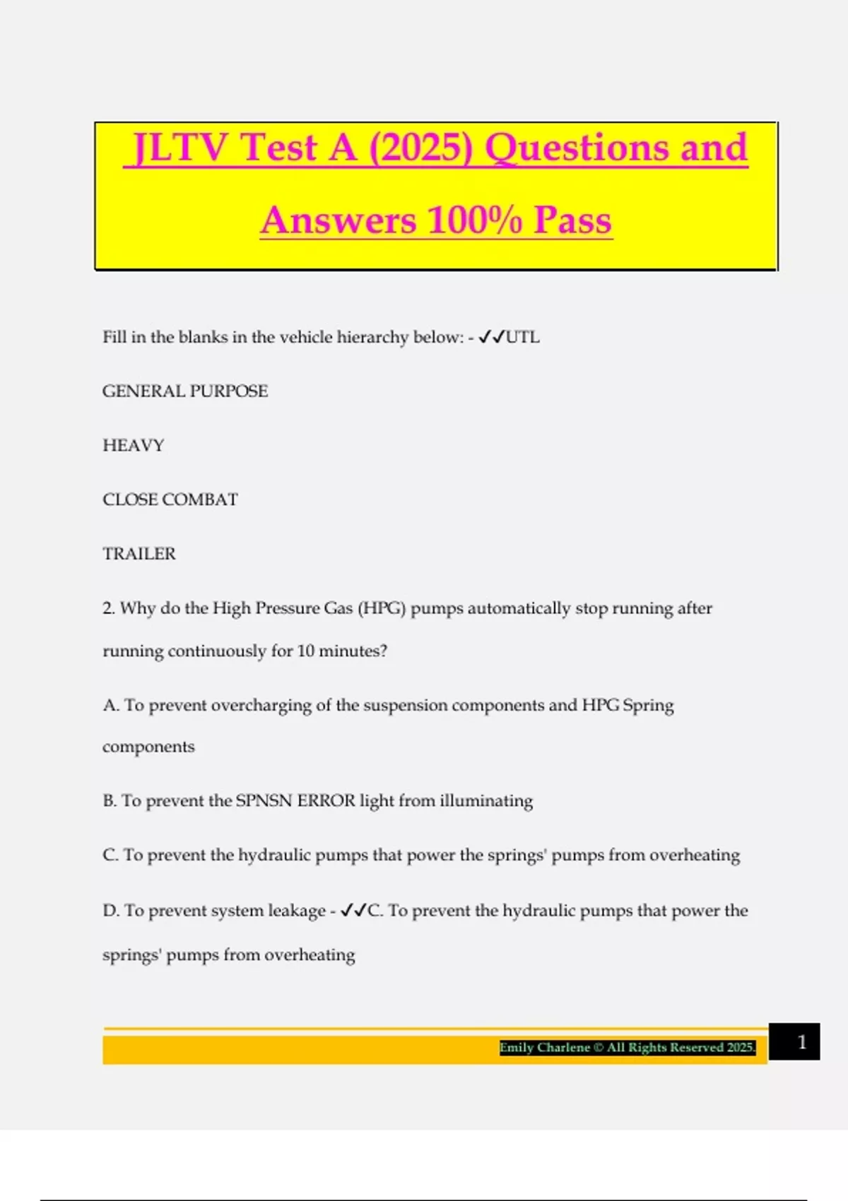 JLTV Test A (2025) Questions and Answers 100% Pass Fill in the blanks in the vehicle hierarchy below: - UTL GENERAL PURPOSE HEAVY CLOSE COMBAT TRAILER 2. Why do the High Pressure Gas (HPG) pumps automatically stop running after running continuously for 10 minutes? A. To prevent overcharging of the suspension components and HPG Spring components B. To prevent the SPNSN ERROR light from illuminating C. To prevent the hydraulic pumps that power the springs' pumps from overheating D. To prevent system leakage - C. To prevent the hydraulic pumps that power the springs' pumps from overheating 2Emily Charlene © All Rights Reserved 2025. 3. The transaxle receives power from the A. Engine B. Transmission C. CTIS D. Suspension system - Transmission Height for mudding stuff - 30in, 60in 5. Air over hydraulic brakes function by: A. The engine-driven belt provides power to the hydraulic pumps for the brakes. B. The air pressure for service brakes is monitored by the CTIS, CTIS sends the signal to the hydraulic components of when to apply or not apply. C. The CAC controls the air circulation directly to the service brake, when the service brake is engaged it pushes hydraulic fluid through the lines to activate the brakes. When the air system is charged, the air pressure holds the hydraulic braking components open so they cannot apply; when service brake applied, it drops psi allowing hydraulic components to apply/engage. - When the air system is charged, the air pressure holds the hydraulic braking components open so they cannot apply; when service brake applied, it drops psi allowing hydraulic components to apply/engage. 3Emily Charlene © All Rights Reserved 2025. Locate the buttons on the MUX panel - Blackout Switch Head Lights and Clearence Lights Internal Dome Light Selector Dome Light Dimmer Dash Light Dimmer 7. List the five Suspension Settings the DRIVER uses. - Answer: Operational, Loading, Tie Down, Fording, and SAES 8. Combat Override is only to be used in emergency situations, which of the factors below are true for how Combat Override affects the JLTV? A. Provides for an emergency bypass in the event of DSDU failure. B. Disables neutral safety start C. Bypasses all speed limitations protecting the drivetrain and CTIS settings protecting the wheels D. All of the above. - All of the above