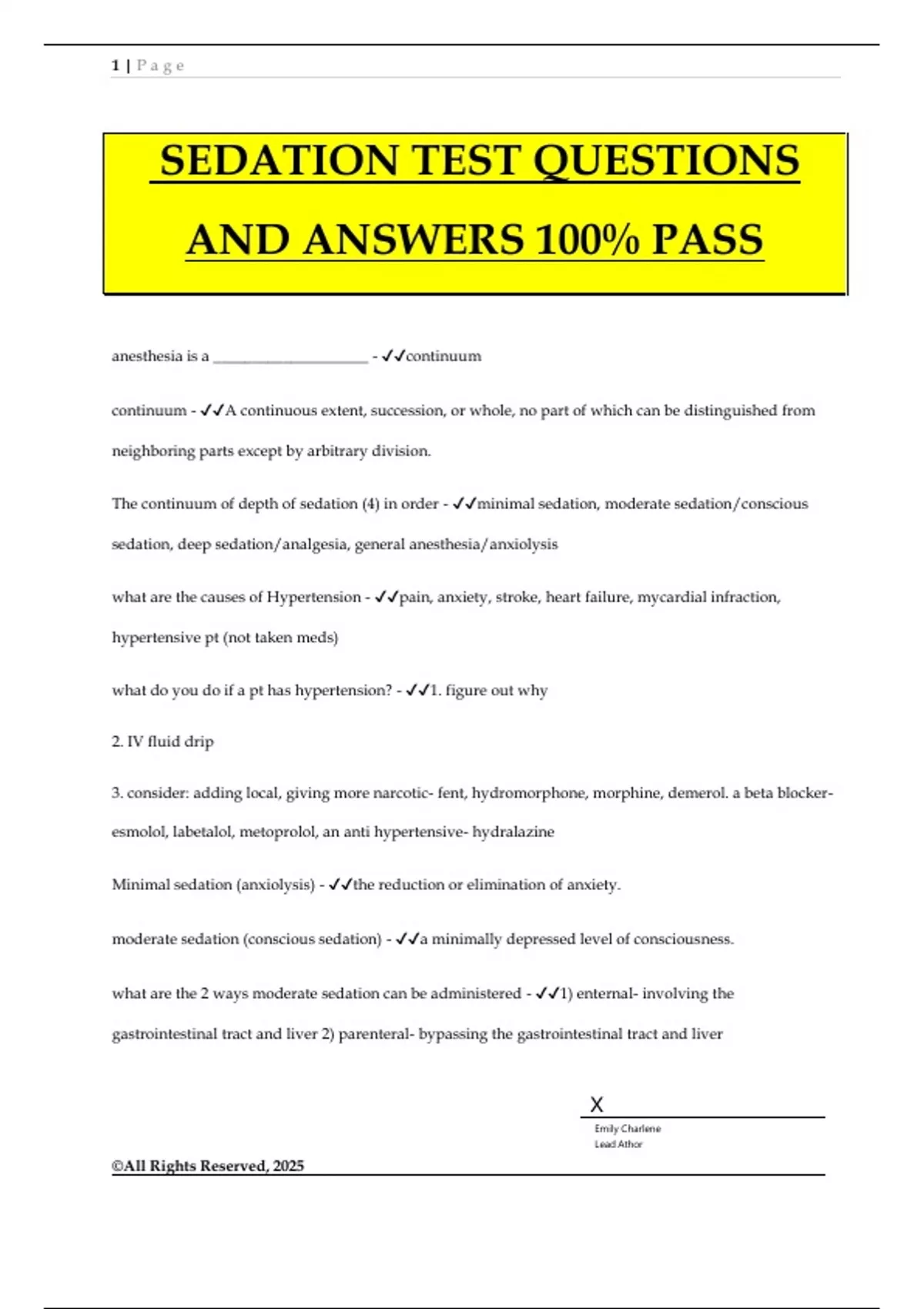 SEDATION TEST QUESTIONS AND ANSWERS 100% PASS anesthesia is a ____________________ - continuum continuum - A continuous extent, succession, or whole, no part of which can be distinguished from neighboring parts except by arbitrary division. The continuum of depth of sedation (4) in order - minimal sedation, moderate sedation/conscious sedation, deep sedation/analgesia, general anesthesia/anxiolysis what are the causes of Hypertension - pain, anxiety, stroke, heart failure, mycardial infraction, hypertensive pt (not taken meds) what do you do if a pt has hypertension? - 1. figure out why 2. IV fluid drip 3. consider: adding local, giving more narcotic- fent, hydromorphone, morphine, demerol. a beta blocker- esmolol, labetalol, metoprolol, an anti hypertensive- hydralazine Minimal sedation (anxiolysis) - the reduction or elimination of anxiety. moderate sedation (conscious sedation) - a minimally depressed level of consciousness. what are the 2 ways moderate sedation can be administered - 1) enternal- involving the gastrointestinal tract and liver 2) parenteral- bypassing the gastrointestinal tract and liver 2 | P a g e ©All Rights Reserved, 2025 X Emily Charlene Lead Athor routes of administration of moderate sedation- enteral! - *reminder* enternal means involving gastrointestinal tract •oral •rectal •sublingual routes of administration of moderate sedation- parenteral! - *reminder* parenteral is bypassing the gastrointestinal tract and liver •intravenous IV •intramuscular IM •intranasal IN •subcutaneous •intraosseous IO •pulmonary •sublingual •transdermal what are the advantages of enternal conscious sedation? - inexpensive, easy, sterile technique not required