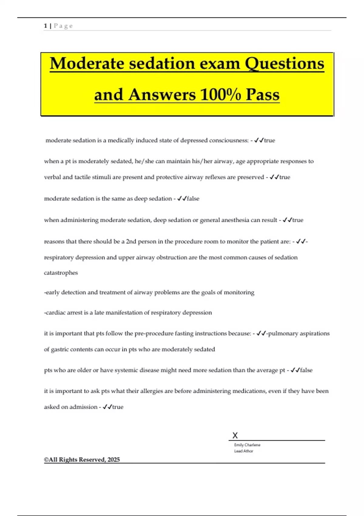 Moderate sedation exam Questions and Answers 100% Pass moderate sedation is a medically induced state of depressed consciousness: - true when a pt is moderately sedated, he/she can maintain his/her airway, age appropriate responses to verbal and tactile stimuli are present and protective airway reflexes are preserved - true moderate sedation is the same as deep sedation - false when administering moderate sedation, deep sedation or general anesthesia can result - true reasons that there should be a 2nd person in the procedure room to monitor the patient are: - - respiratory depression and upper airway obstruction are the most common causes of sedation catastrophes -early detection and treatment of airway problems are the goals of monitoring -cardiac arrest is a late manifestation of respiratory depression it is important that pts follow the pre-procedure fasting instructions because: - -pulmonary aspirations of gastric contents can occur in pts who are moderately sedated pts who are older or have systemic disease might need more sedation than the average pt - false it is important to ask pts what their allergies are before administering medications, even if they have been asked on admission - true