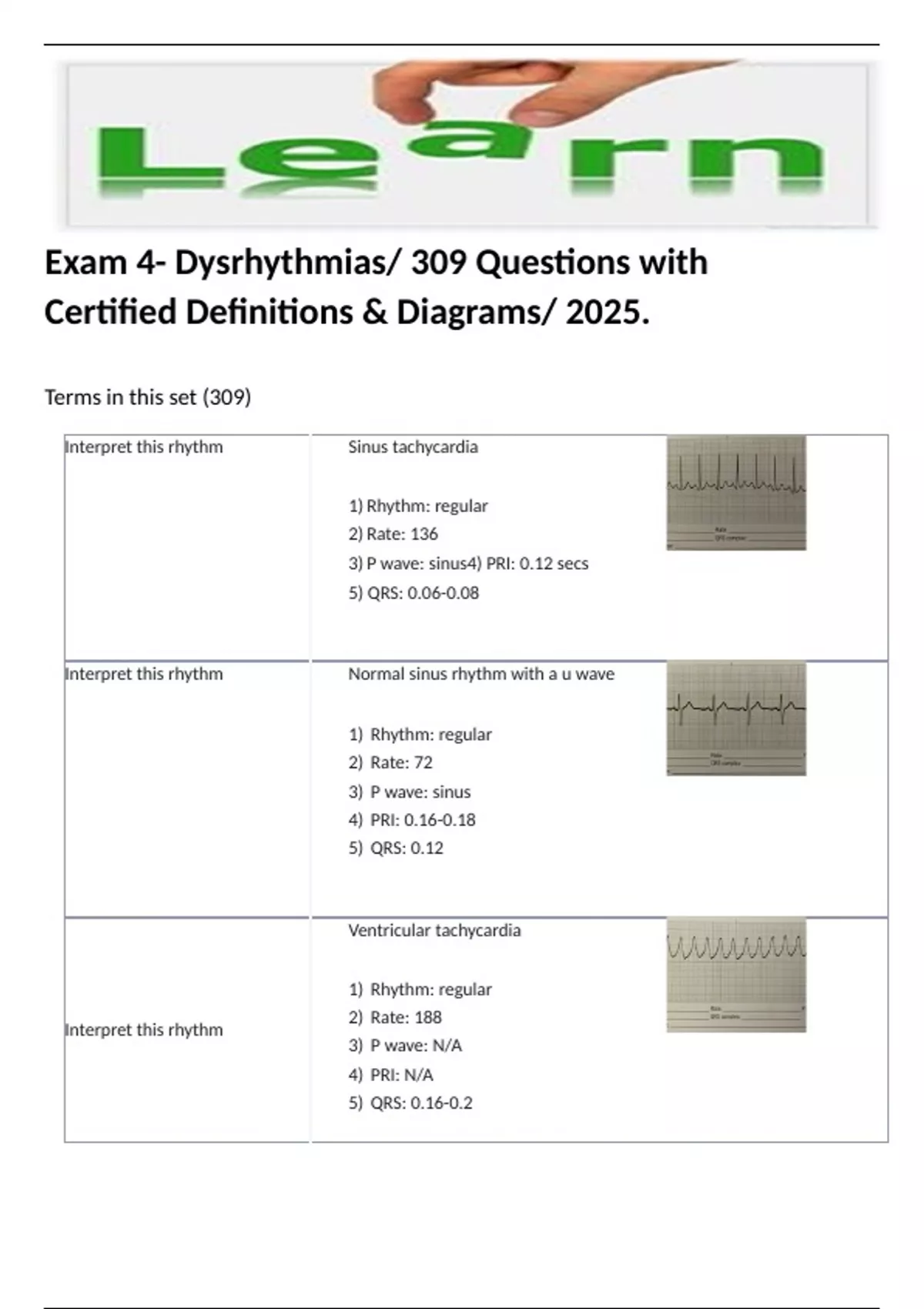 Exam 4- Dysrhythmias/ 309 Questions with Certified Definitions & Diagrams/ 2025. Interpret this rhythm Sinus tachycardia 1) Rhythm: regular 2) Rate: 136 3) P wave: sinus 4) PRI: 0.12 secs 5) QRS: 0.06-0.08 Interpret this rhythm Normal sinus rhythm with a u wave 1) Rhythm: regular 2) Rate: 72 3) P wave: sinus 4) PRI: 0.16-0.18 5) QRS: 0.12 Interpret this rhythm Ventricular tachycardia 1) Rhythm: regular 2) Rate: 188 3) P wave: N/A 4) PRI: N/A 5) QRS: 0.16-0.2 Interpret this rhythm Sinus bradycardia with one PVC and a depressed ST segment 1) Rhythm: regular 2) Rate: 56 3) P wave: sinus 4) PRI: 0.16-0.2 5) QRS: 0.04-0.08 Interpret this rhythm Sinus tachycardia 1) Rhythm: regular 2) Rate: 115 3) P wave: sinus 4) PRI: 0.14-0.16 5) QRS: 0.04-0.06 Interpret this rhythm Sinus bradycardia with elevated ST segment 1) Rhythm: regular 2) Rate: 48 3) P wave: sinus 4) PRI:0.12-0.16 5) QRS: 0.08 Interpret this rhythm Ventricular fibrillation (course) 1) Rhythm: irregular and chaotic 2) Rate: N/A 3) P wave: N/A 4) PRI: N/A 5) QRS: N/A Interpret this rhythm Asystole 1) Rhythm: N/A 2) Rate: N/A 3) P wave: sinus; 34 bpm; regular 4) PRI: N/A 5) QRS: N/A Interpret this rhythm Normal sinus rhythm with depressed ST segment and inverted T-wave 1) Rhythm: regular 2) Rate: 72 3) P wave: sinus 4) PRI: .2 5) QRS: 0.08-0.10 Interpret this rhythm Normal sinus rhythm with one PAC at the 5th complex and a u wave 1) Rhythm: regular (underlying) with premature beats 2) Rate: 63 (underlying) 3) P wave: sinus, premature beat different (pointed) 4) PRI: 0.14-0.16 9 (underlying) 5) QRS: 0.08 (underlying Interpret this rhythm Normal sinus rhythm with couplet PVC and a u wave 1) Rhythm: regular 2) Rate: 72-75 3) P wave: normal 4) PRI: 0.12-0.16 5) QRS:0.12 Interpret this rhythm Asystole 1) Rhythm: N/A 2) Rate: N/A 3) P wave: N/A 4) PRI: N/A 5) QRS: N/A