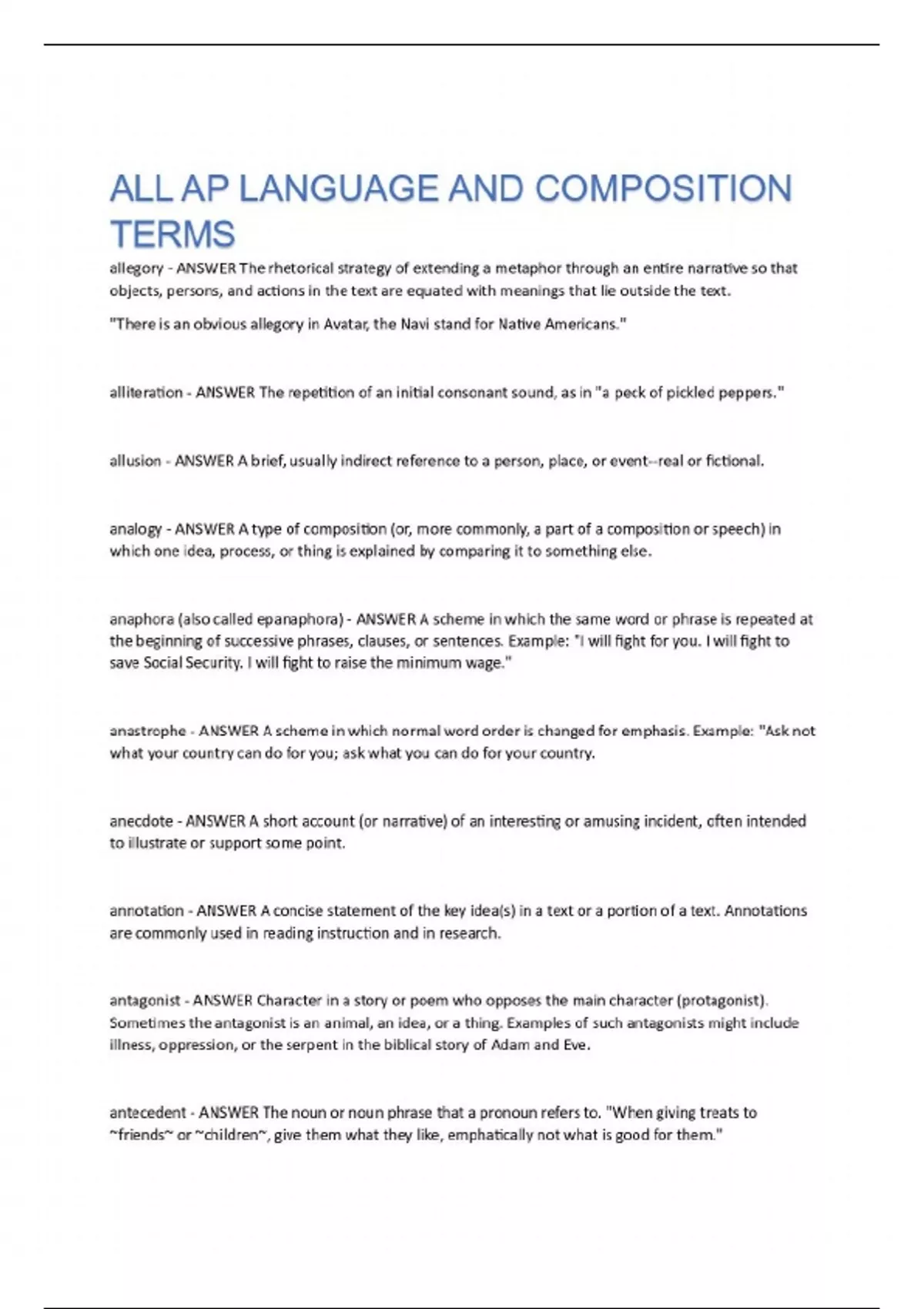 ALL AP LANGUAGE AND COMPOSITION TERMS questions and answers with solutions 2025