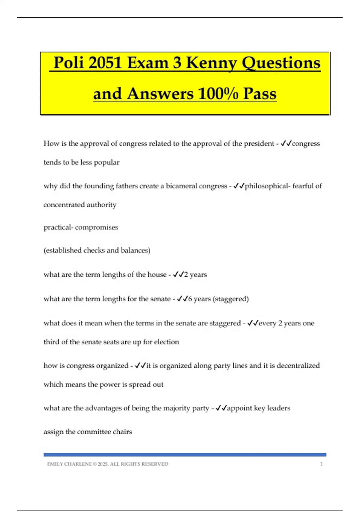 Poli 2051 Exam 3 Kenny Questions and Answers 100% Pass How is the approval of congress related to the approval of the president - congress tends to be less popular why did the founding fathers create a bicameral congress - philosophical- fearful of concentrated authority practical- compromises (established checks and balances) what are the term lengths of the house - 2 years what are the term lengths for the senate - 6 years (staggered) what does it mean when the terms in the senate are staggered - every 2 years one third of the senate seats are up for election how is congress organized - it is organized along party lines and it is decentralized which means the power is spread out what are the advantages of being the majority party - appoint key leaders assign the committee chairs EMILY CHARLENE © 2025, ALL RIGHTS RESERVED 2 control the agenda oversight of the executive branch what are the two functions of congress - lawmaking representative what are the basic steps of how a bill becomes a law (lawmaking) - bill must be introduced the committee/subcommittee discuss it goes up for debate on floor of chamber conference committee pres signs and puts out a statement what does representing mean in terms of understanding congress - ceremonial appearances and speeches Representatives can act as either a delegate or trustee. What is the difference? - Delegates are representatives who follow everything their district wants and trustees are representatives that the people in their district trust to make good decisions on their behalf. what are two common regularitites in congressional elections - -incumbents rarely lose EMILY CHARLENE © 2025, ALL RIGHTS RESERVED 3 -pres party gains seats in a pres election and loses seats in midterm elections why do incumbents rarely lose congressional elections - they have a host of official resources have high levels of name recognition have easier time raising money redistricting, campaign experience what are some theories that tries to explain why the previous party gain seats in a pres election but lose seats in the midterm? - Surge and decline theory, Referendum Theory, and Balance theory What is the surge and decline theory? - Independent voters will vote in presidential elections but not so much in congressional elections.