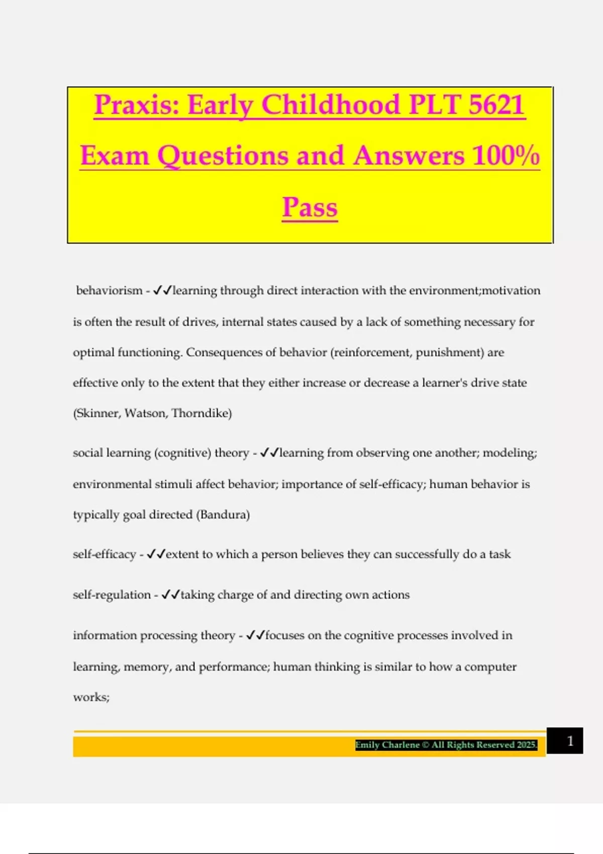 Praxis: Early Childhood PLT 5621 Exam Questions and Answers 100% Pass behaviorism - learning through direct interaction with the environment;motivation is often the result of drives, internal states caused by a lack of something necessary for optimal functioning. Consequences of behavior (reinforcement, punishment) are effective only to the extent that they either increase or decrease a learner's drive state (Skinner, Watson, Thorndike) social learning (cognitive) theory - learning from observing one another; modeling; environmental stimuli affect behavior; importance of self-efficacy; human behavior is typically goal directed (Bandura) self-efficacy - extent to which a person believes they can successfully do a task self-regulation - taking charge of and directing own actions information processing theory - focuses on the cognitive processes involved in learning, memory, and performance; human thinking is similar to how a computer works; 2Emily Charlene © All Rights Reserved 2025. constructivism - people create knowledge through observations and experience; people combine much of what they learn into integrated bodies of knowledge and beliefs (schemas); by working together, two or more people can often gain better understandings than anyone could gain alone (social constructivism) sociocultural theory - emphasize that the social, cultural, and historical contexts in which children grow up have profound influences on thinking, learning, and effective instructional practice; Because of their varying environments, historical circumstances, and needs, different cultures have developed somewhat different ways of thinking, learning, and teaching classical conditioning (Pavlov) - when automatic and reflexive responses to stimuli become associated with new stimuli that previously had no effect (When a conditioned stimulus (e.g., a buzzer regularly paired with the puff of air) evokes a conditioned response (e.g., blinking), learning has occurred) operant conditioning (Skinner) - occurs as a result of the consequences of behavior; Behaviors that are reinforced are strengthened — they are repeated. Reinforcers can be positive (e.g., presentation of a reward) or negative (e.g., removal of an aversive stimulus). Behaviors that are punished are extinguished; punishments, too can be positive (e.g., presentation of an aversive stimulus) or negative (removal of a positive stimulus) 3Emily Charlene © All Rights Reserved 2025. sensory register (short term memory) - Component of memory that holds incoming information in an unanalyzed form for a very brief time (perhaps one to two seconds) working memory - Component of memory that holds and actively thinks about and processes a limited amount of information long term memory - Component of memory that holds knowledge and skills for a relatively long time semantic knowledge - Knowledge of the meanings of words and word combinations procedural knowledge - Knowledge concerning how to do something (e.g., a skill) how to move info into long term memory - Rehearsal Meaningful learning Elaboration Organization Visual imagery Mnemonics accommodation - required when people must incorporate a new experience by modifying an old scheme or forming a new scheme (The period of flux when individuals are attempting to adjust prior schemes with new experiences that do not fit 4Emily Charlene © All Rights Reserved 2025. into their existing schemes is known as disequilibrium, and the process of moving from disequilibrium to a new state of learning is known as equilibration) assimilation - when people deal with a new experience in a manner that is consistent with a present scheme scheme - organized group of similar actions or thoughts that are used repeatedly in response to the environment Piaget's stages of cognitive development - sensorimoto