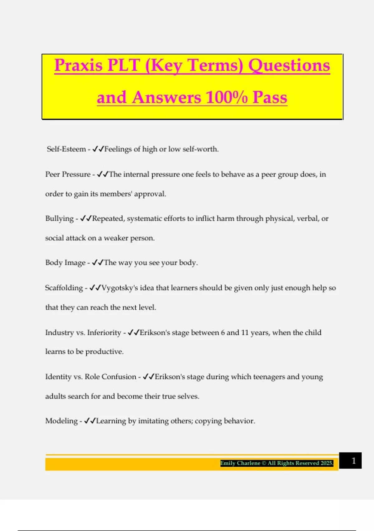 1Emily Charlene © All Rights Reserved 2025. Praxis PLT (Key Terms) Questions and Answers 100% Pass Self-Esteem - Feelings of high or low self-worth. Peer Pressure - The internal pressure one feels to behave as a peer group does, in order to gain its members' approval. Bullying - Repeated, systematic efforts to inflict harm through physical, verbal, or social attack on a weaker person. Body Image - The way you see your body. Scaffolding - Vygotsky's idea that learners should be given only just enough help so that they can reach the next level. Industry vs. Inferiority - Erikson's stage between 6 and 11 years, when the child learns to be productive. Identity vs. Role Confusion - Erikson's stage during which teenagers and young adults search for and become their true selves. Modeling - Learning by imitating others; copying behavior. 2Emily Charlene © All Rights Reserved 2025. Teaming - To swap ideas, use two approaches for concept when material is complex, different points of view. Integrated Curriculum - Curriculum in which concepts and skills from various disciplines are combined and related. Integrated Unit - Lessons that integrate, or bring together, more than one content area in a single lesson. Freshman Academy - Separate part of the school, with its own staff; just for Freshmen. Mentoring - Advising people with less experience. Process Writing - Prewriting, drafting, conference, revising, editing, publishing. Cloze Method - A procedure where a word or words has/have been removed and the student must fill them in based on context clues. Writing Across the Curriculum - Incorporating writing activities into science, social studies, math, and other subjects as appropriate. Cooperative Learning - Small groups of classmates work toward common goals. Jigsaw Learning - A cooperative learning strategy: groups find different pieces of information, then come together to combine it. 3Emily Charlene © All Rights Reserved 2025. KWL Chart - Activating prior knowledge activity: K: know W: want to know L: learned & still want to learn STAD - A cooperative learning method for mixed ability groups involving team recognition and group responsibility for individual learning. Accommodations - Variables that can be: High