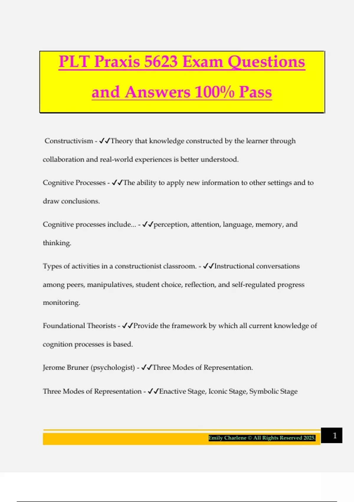 PLT Praxis 5623 Exam Questions and Answers 100% Pass Constructivism - Theory that knowledge constructed by the learner through collaboration and real-world experiences is better understood. Cognitive Processes - The ability to apply new information to other settings and to draw conclusions. Cognitive processes include... - perception, attention, language, memory, and thinking. Types of activities in a constructionist classroom. - Instructional conversations among peers, manipulatives, student choice, reflection, and self-regulated progress monitoring. Foundational Theorists - Provide the framework by which all current knowledge of cognition processes is based. Jerome Bruner (psychologist) - Three Modes of Representation. Three Modes of Representation - Enactive Stage, Iconic Stage, Symbolic Stage 2Emily Charlene © All Rights Reserved 2025. Enactive Stage (Three Modes of Representation) - 0-1 year: Learnign Through Action Iconic Stage (Three Modes of Representation) - 1-6 years: Learning Through Mental Prictures Symbolic Stage (Three Modes of Representation) - 7+ years: Learning Through Language Albert Bandura (psychologist) - Developed the social learning theory. Behavioral changes occur when these four processes are present (Bandura): - Attention, retention, reproduction, and motivation. Social Learning Theory - People learn from one another, through observation, imitation, and modeling. John Dewey - Viewed learning as a series of scientific inquiry and experimentation. Jean Piaget (psychologist) - First to study cognition in children. Piaget's Stages of Development - Sensorimotor, Preoperational, Concrete Operational, and Formal Operational. Piaget's Sensorimotor Stage - Birth - Two Years: When children develop the concept of object permanence. 3Emily Charlene © All Rights Reserved 2025. Piaget's Preoperational Stage - Two - Seven Years: When children engage in symbolic play, but they do not have the ability to think abstractly or to see another person's perspective. Piaget's Concrete Operational Stage - Seven - Eleven Years: Children are more capable of thinking logically, making inferences, and viewing things from more than one perspective. Piaget's Formal Operational Stage - Eleven - Adulthood: People are able to think abstractly, transfer knowledge, and mentally process information. Lev Vygotsky - Social Development Theory More Knowledgeable Other (Vygotsky) - The person who models a new activity, such as the teacher, peer, or technology program. Zone of Proximal Development (Vygotsky) - Keeps student's working between what the can do independently and what they need help with. Challenging without being frustrating. Scaffolding Learning Goals - Independent practice -> Guided practice -> learning goals Lawrence Kohlberg - Stages of Moral Development