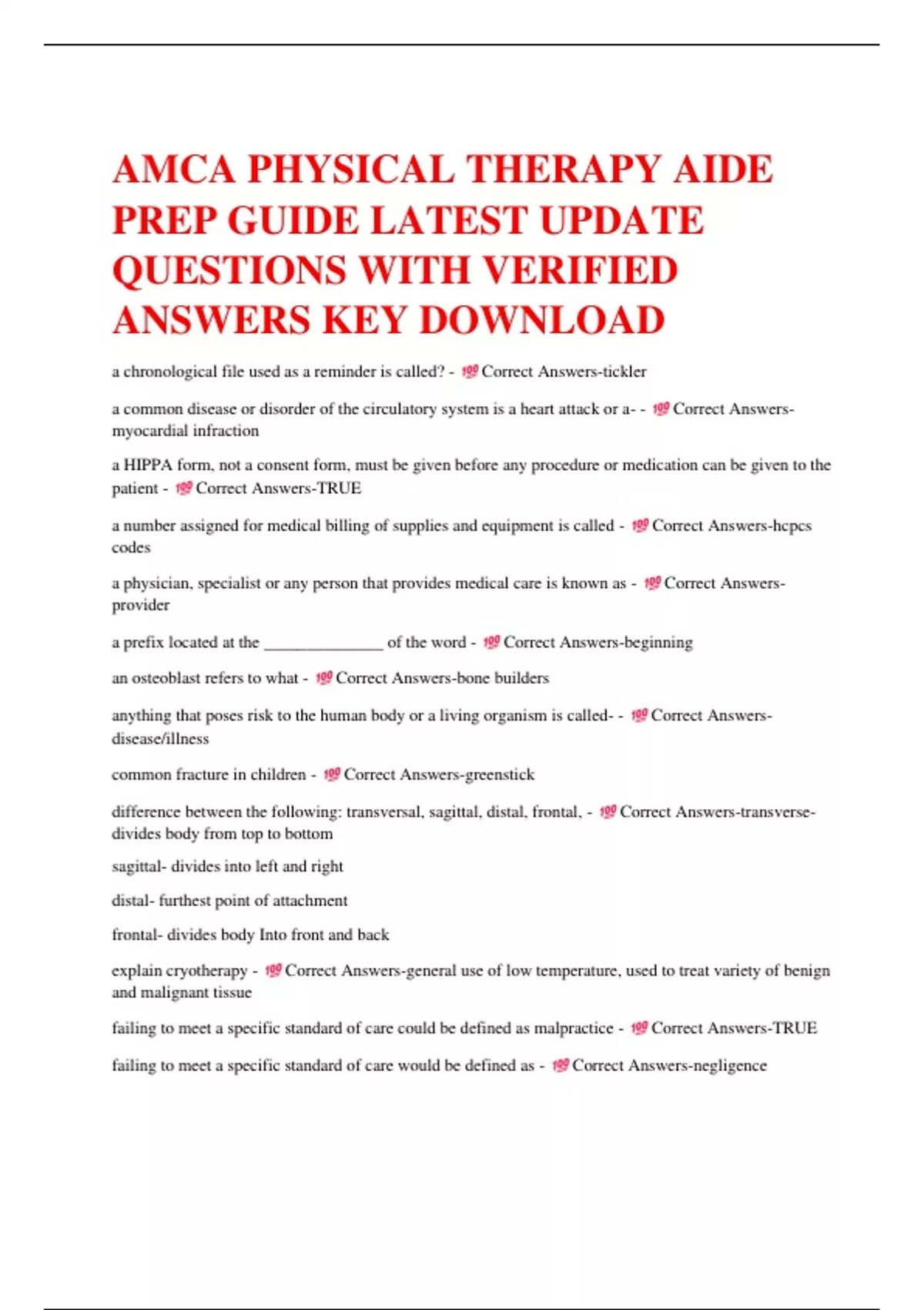 AMCA PHYSICAL THERAPY AIDE PREP GUIDE LATEST UPDATE QUESTIONS WITH VERIFIED ANSWERS KEY DOWNLOAD a chronological file used as a reminder is called? - Correct Answers-tickler a common disease or disorder of the circulatory system is a heart attack or a- - Correct Answersmyocardial infraction a HIPPA form, not a consent form, must be given before any procedure or medication can be given to the patient - Correct Answers-TRUE a number assigned for medical billing of supplies and equipment is called - Correct Answers-hcpcs codes a physician, specialist or any person that provides medical care is known as - Correct Answersprovider a prefix located at the ______________ of the word - Correct Answers-beginning an osteoblast refers to what - Correct Answers-bone builders anything that poses risk to the human body or a living organism is called- - Correct Answersdisease/illness common fracture in children - Correct Answers-greenstick