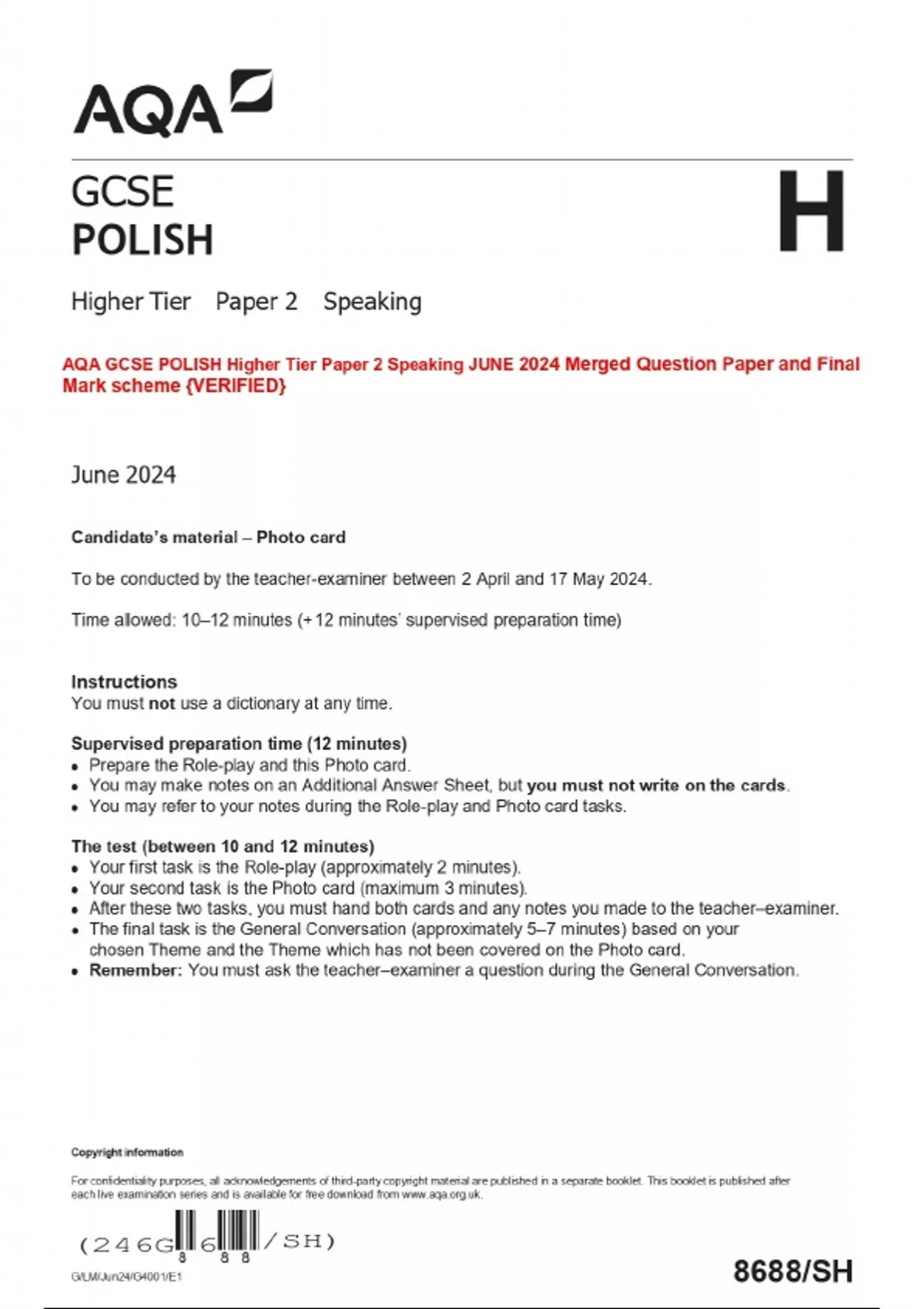 AQA GCSE POLISH Higher Tier Paper 2 Speaking JUNE 2024 Merged Question Paper and Final Mark scheme {VERIFIED}