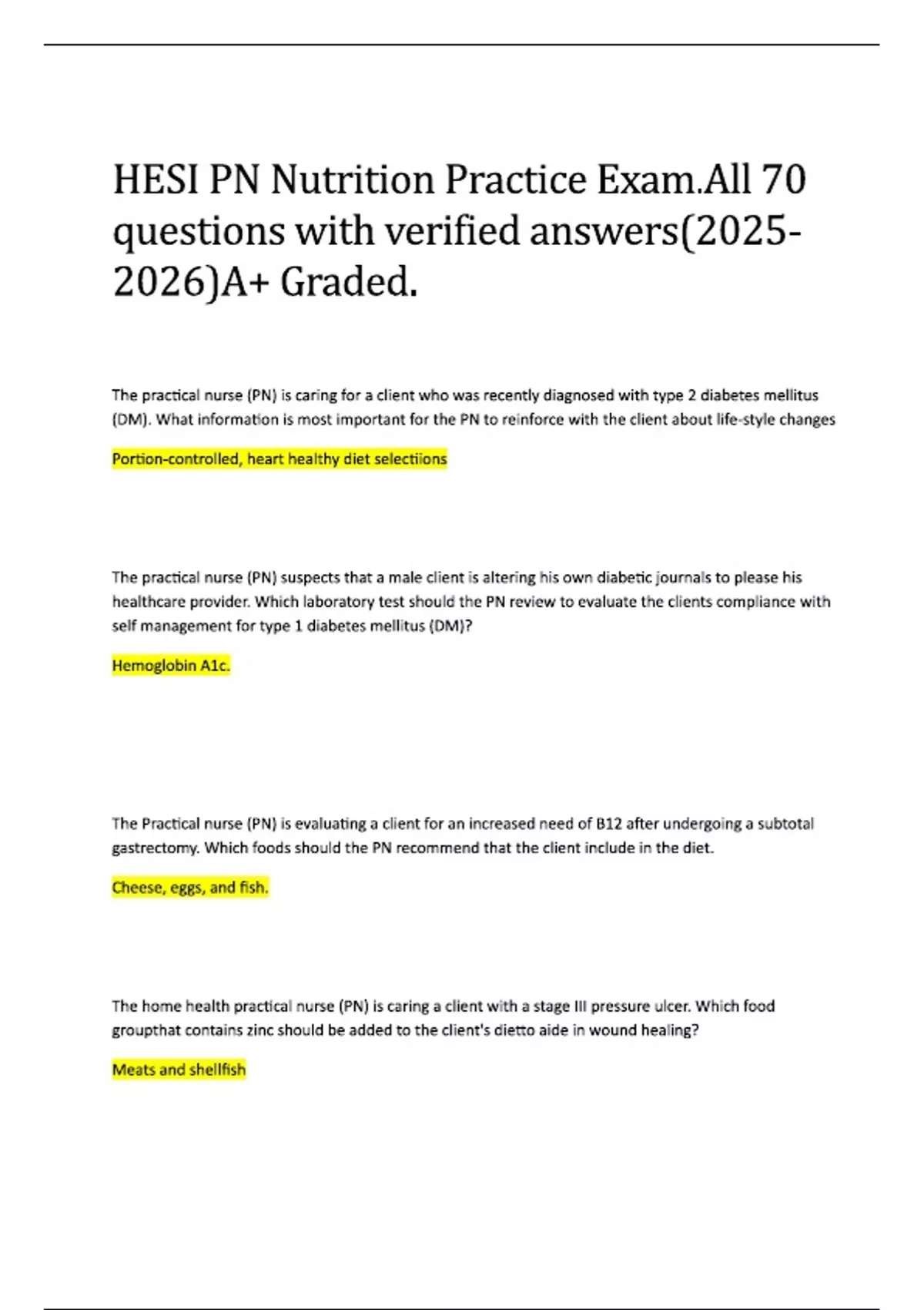 HESI PN Nutrition Practice Exam .All 70 questions with verified answers()A+ Graded