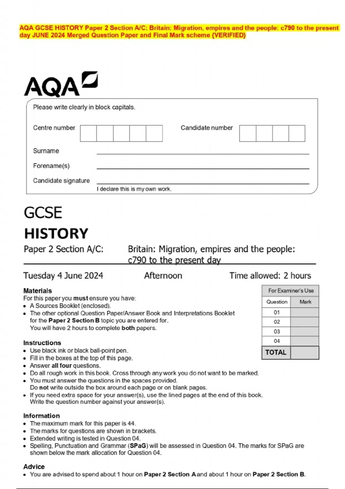 AQA GCSE HISTORY Paper 2 Section A/C: Britain: Migration, empires and the people: c790 to the present day JUNE 2024 Merged Question Paper and Final Mark scheme {VERIFIED}