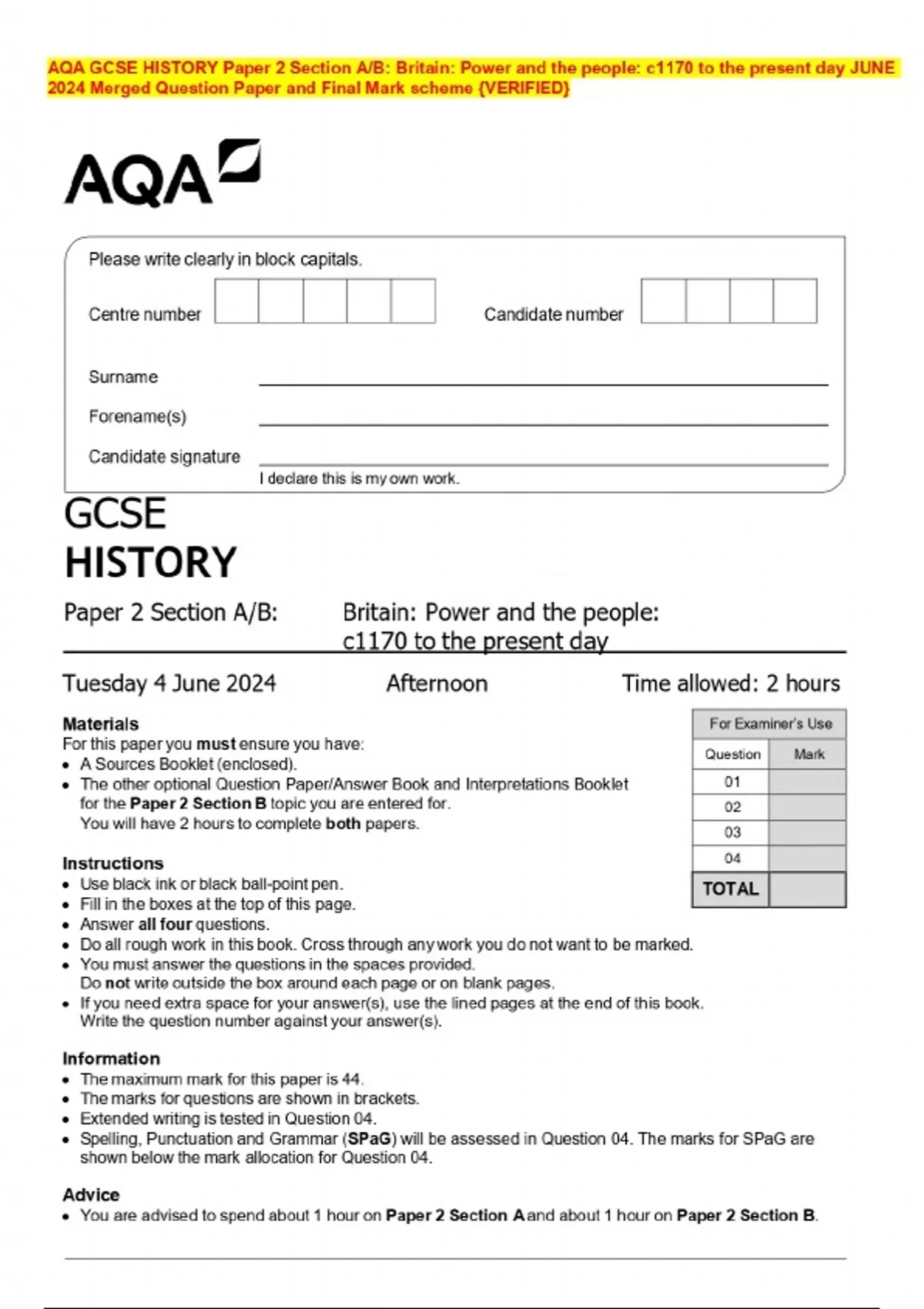 AQA GCSE HISTORY Paper 2 Section A/B: Britain: Power and the people: c1170 to the present day JUNE 2024 Merged Question Paper and Final Mark scheme {VERIFIED}