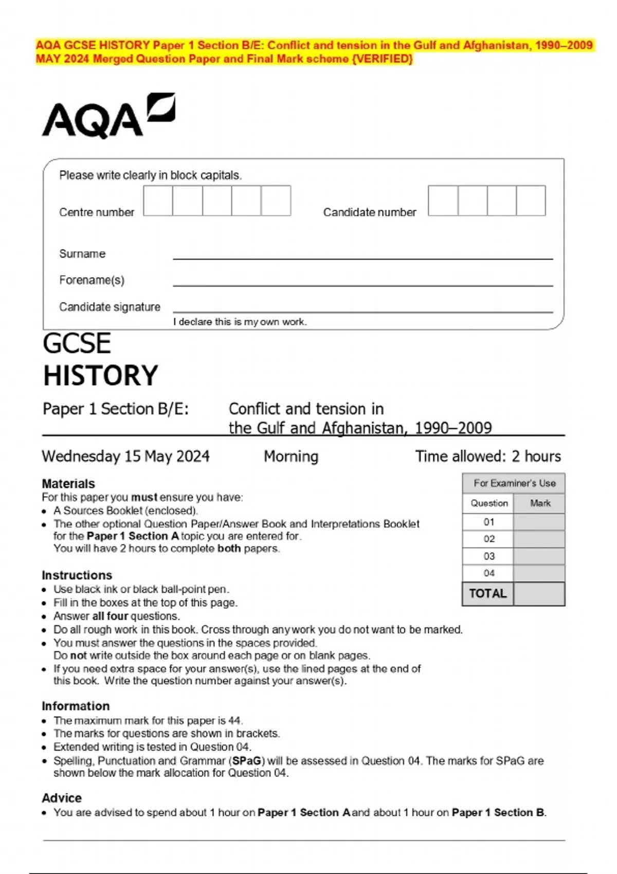 AQA GCSE HISTORY Paper 1 Section B/E: Conflict and tension in the Gulf and Afghanistan, 1990–2009 MAY 2024 Merged Question Paper and Final Mark scheme {VERIFIED}