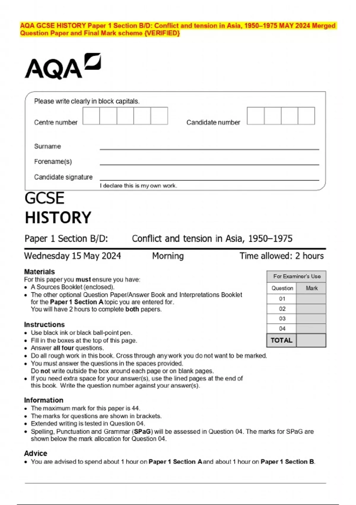 AQA GCSE HISTORY Paper 1 Section B/D: Conflict and tension in Asia, 1950–1975 MAY 2024 Merged Question Paper and Final Mark scheme {VERIFIED}