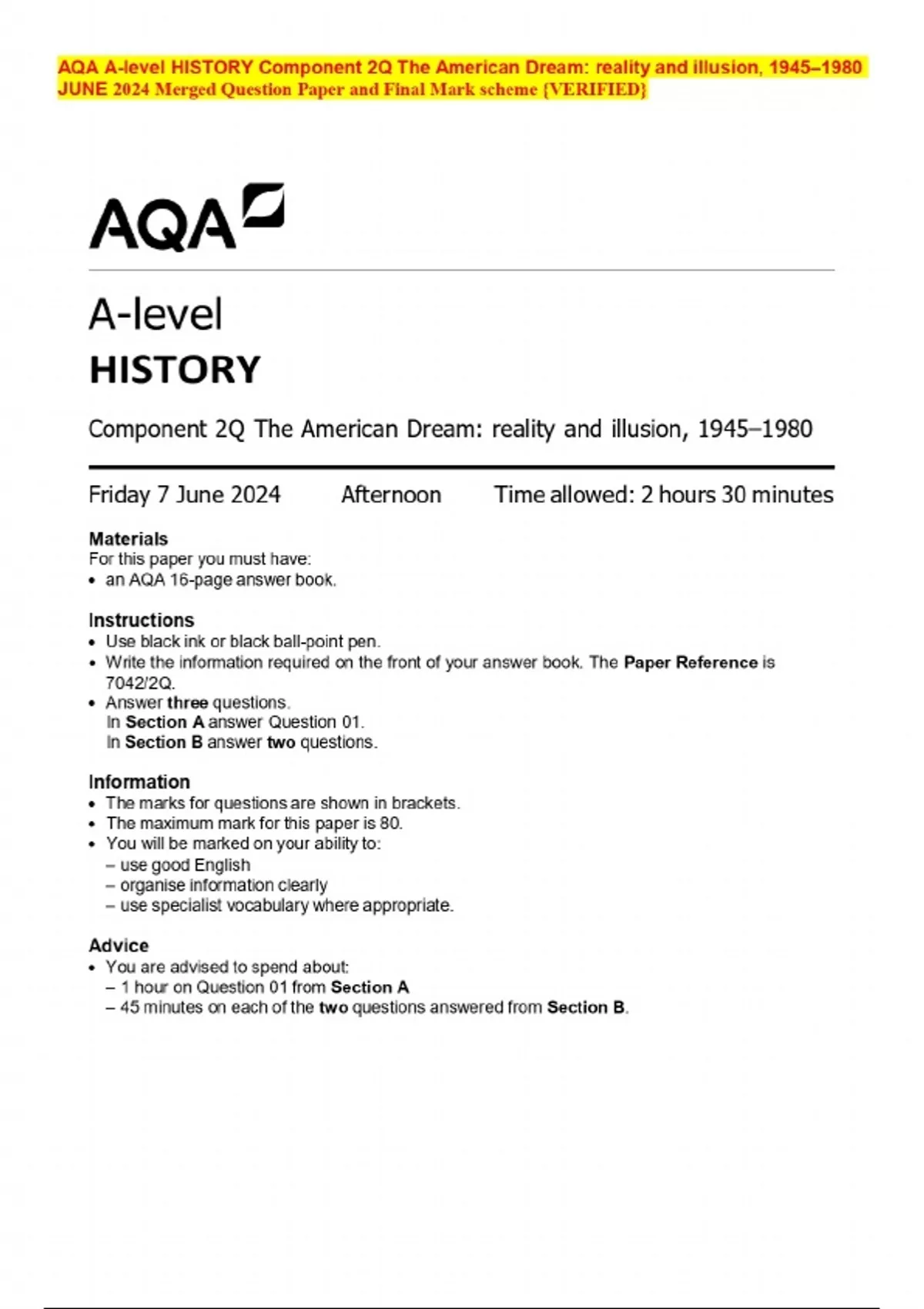 AQA A-level HISTORY Component 2Q The American Dream: reality and illusion, 1945–1980 JUNE 2024 Merged Question Paper and Final Mark scheme {VERIFIED