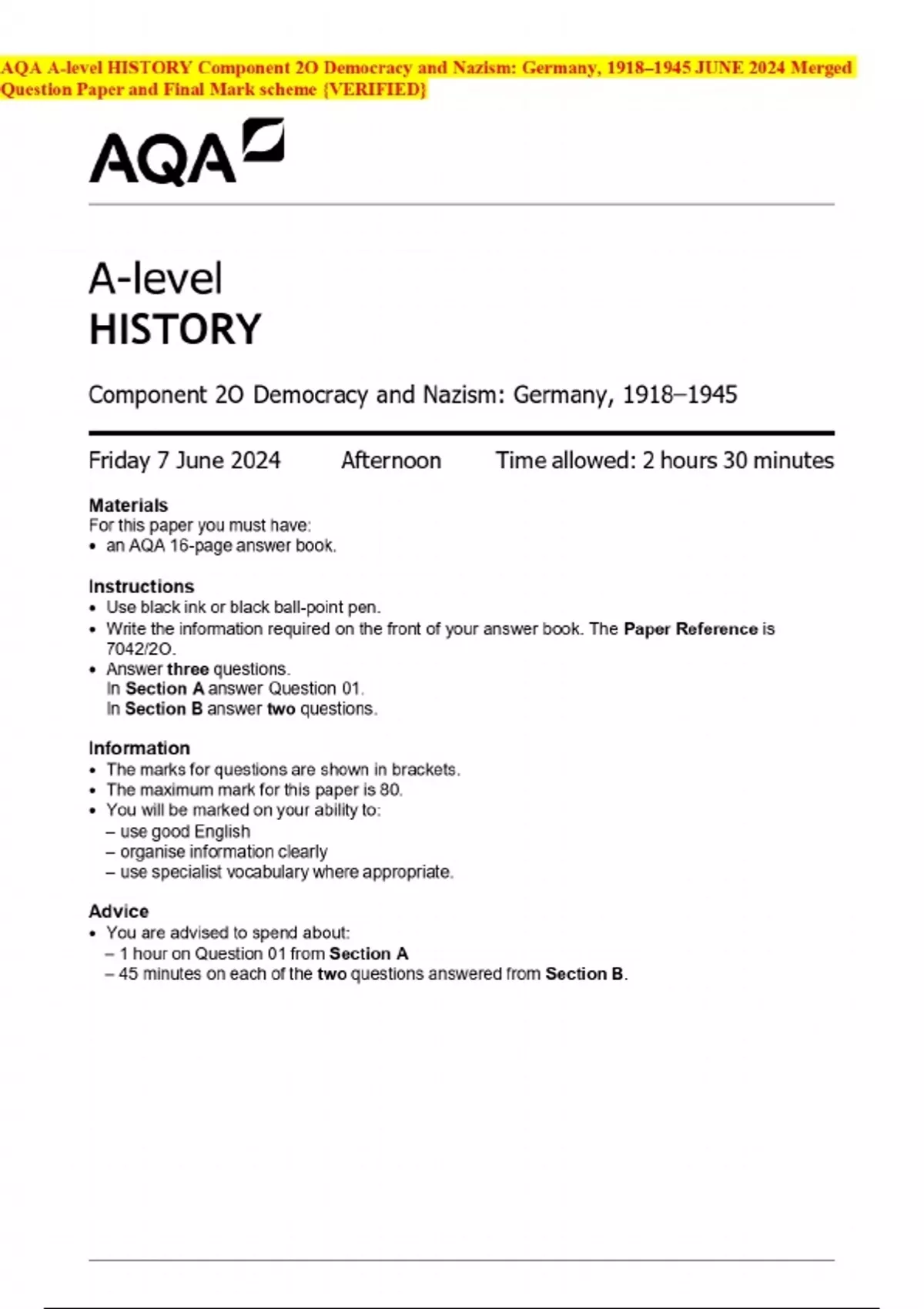 AQA A-level HISTORY Component 2O Democracy and Nazism: Germany, 1918–1945 JUNE 2024 Merged Question Paper and Final Mark scheme {VERIFIED}