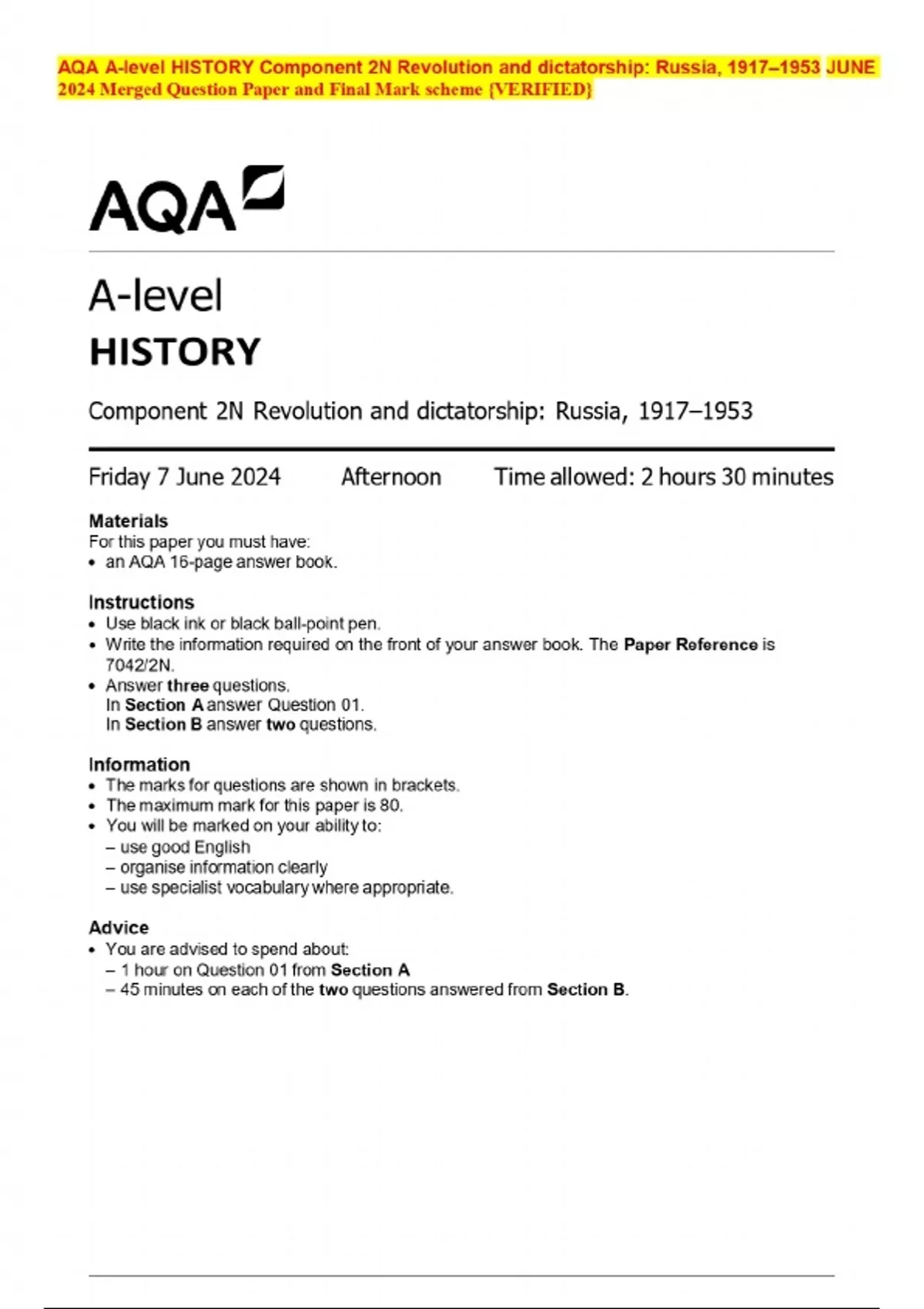 AQA A-level HISTORY Component 2N Revolution and dictatorship: Russia, 1917–1953 JUNE 2024 Merged Question Paper and Final Mark scheme {VERIFIED}
