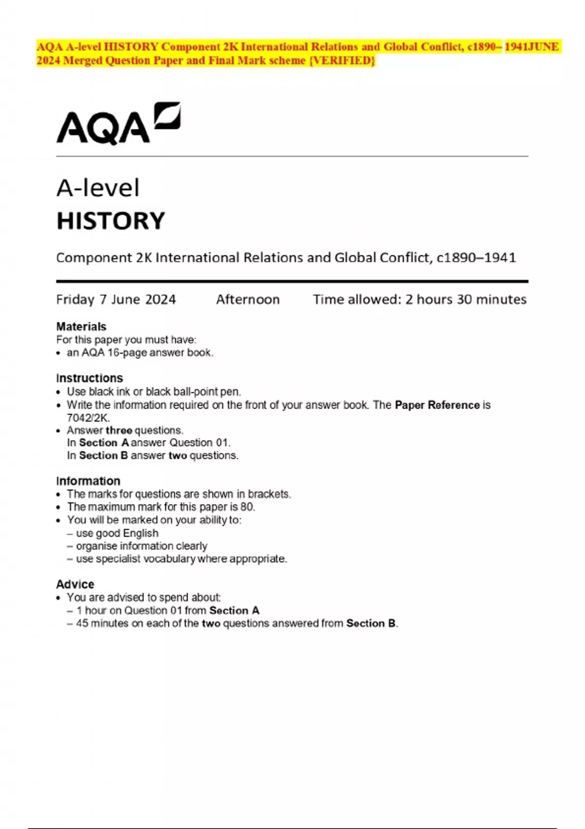 AQA A-level HISTORY Component 2K International Relations and Global Conflict, c1890– 1941JUNE 2024 Merged Question Paper and Final Mark scheme {VERIFIED}