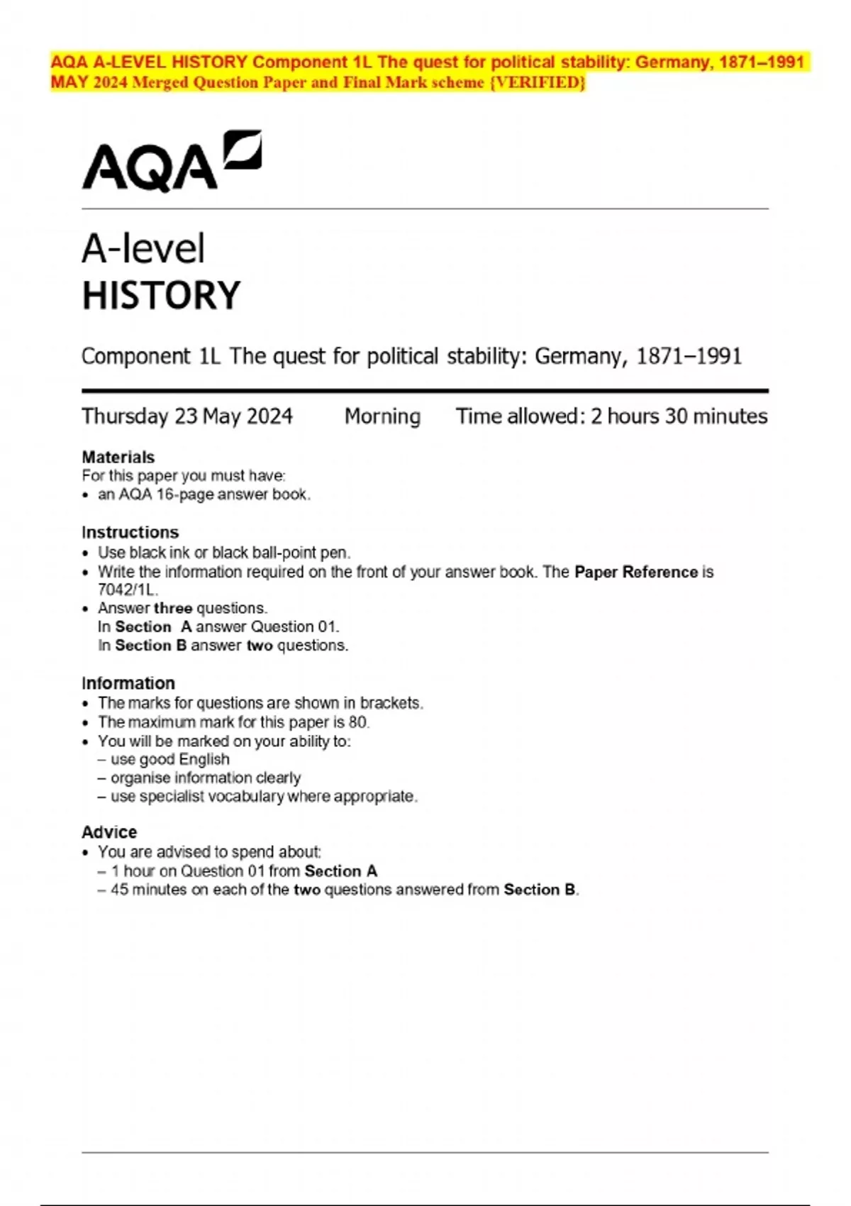 AQA A-LEVEL HISTORY Component 1L The quest for political stability: Germany, 1871–1991 MAY 2024 Merged Question Paper and Final Mark scheme {VERIFIED}
