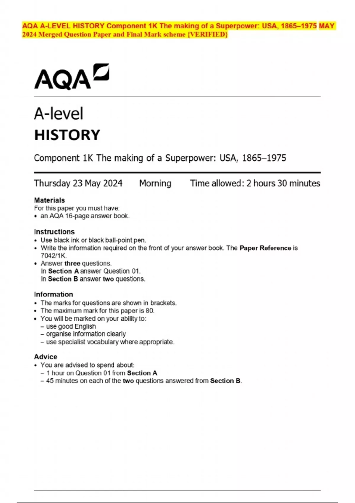 AQA A-LEVEL HISTORY Component 1K The making of a Superpower: USA, 1865–1975 MAY 2024 Merged Question Paper and Final Mark scheme {VERIFIED}