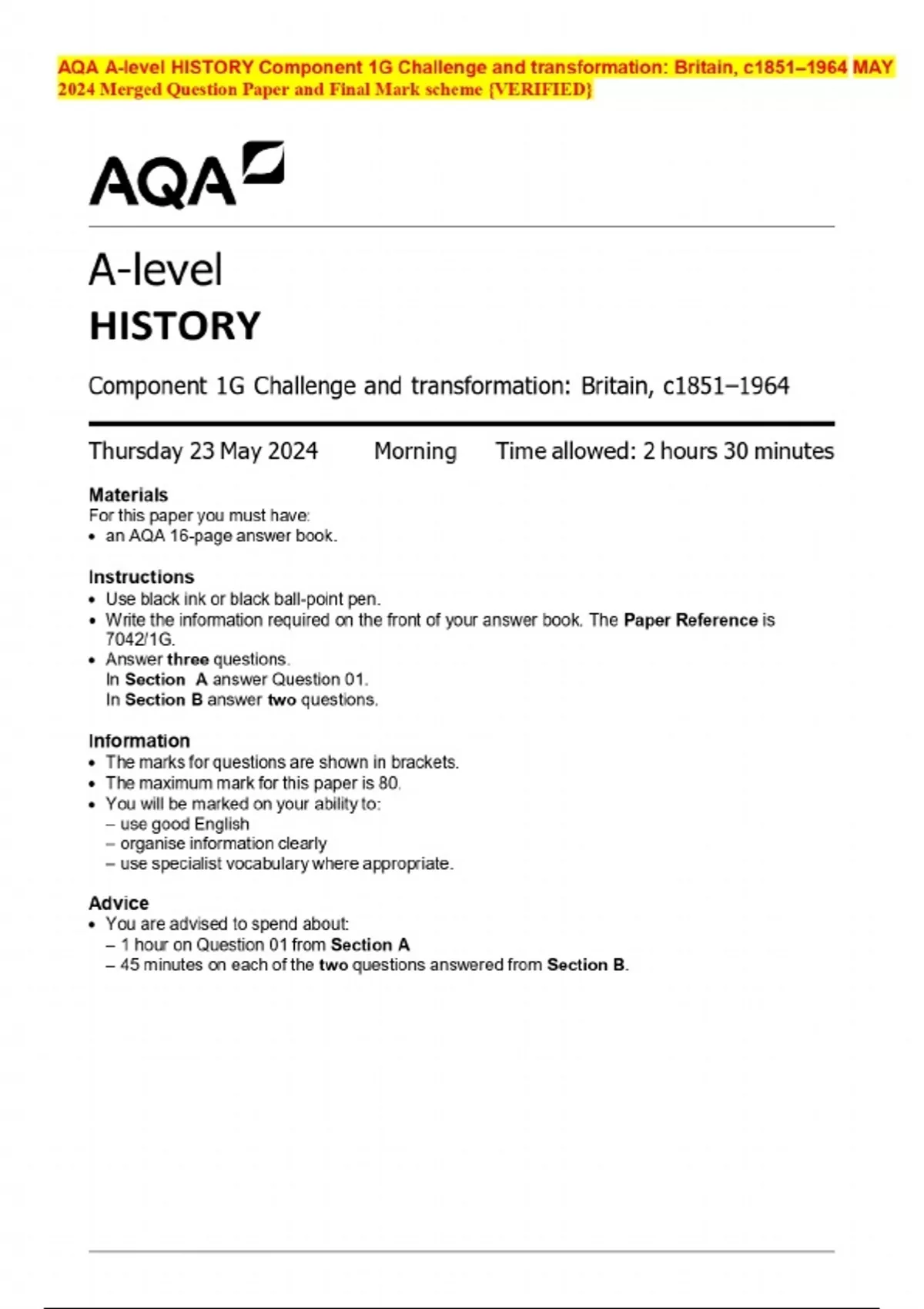 AQA A-level HISTORY Component 1G Challenge and transformation: Britain, c1851–1964 MAY 2024 Merged Question Paper and Final Mark scheme {VERIFIED}