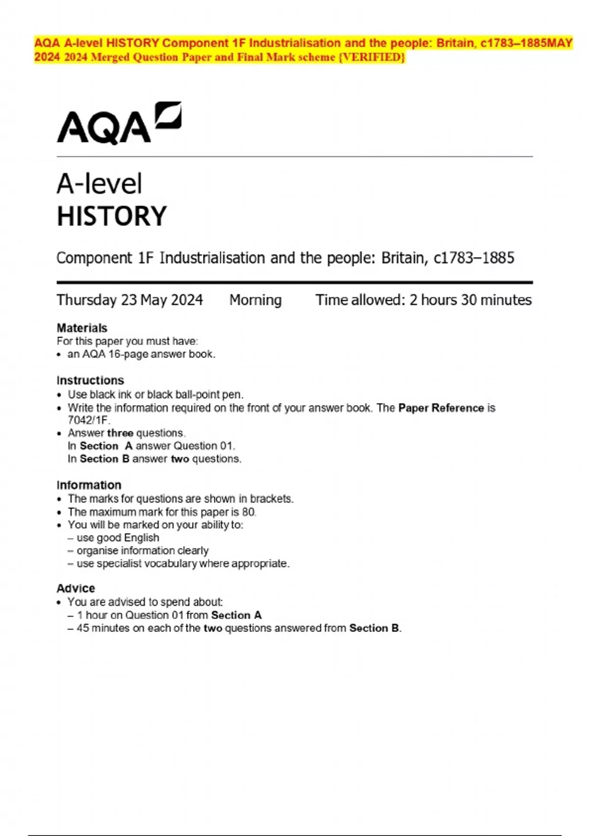 AQA A-level HISTORY Component 1F Industrialisation and the people: Britain, c1783–1885MAY Merged Question Paper and Final Mark scheme {VERIFIED}