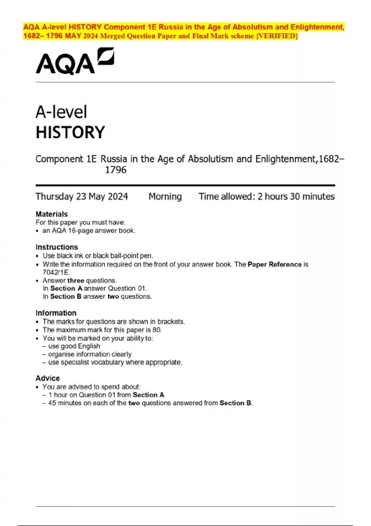 AQA A-level HISTORY Component 1E Russia in the Age of Absolutism and Enlightenment, 1682– 1796 MAY 2024 Merged Question Paper and Final Mark scheme {VERIFIED}