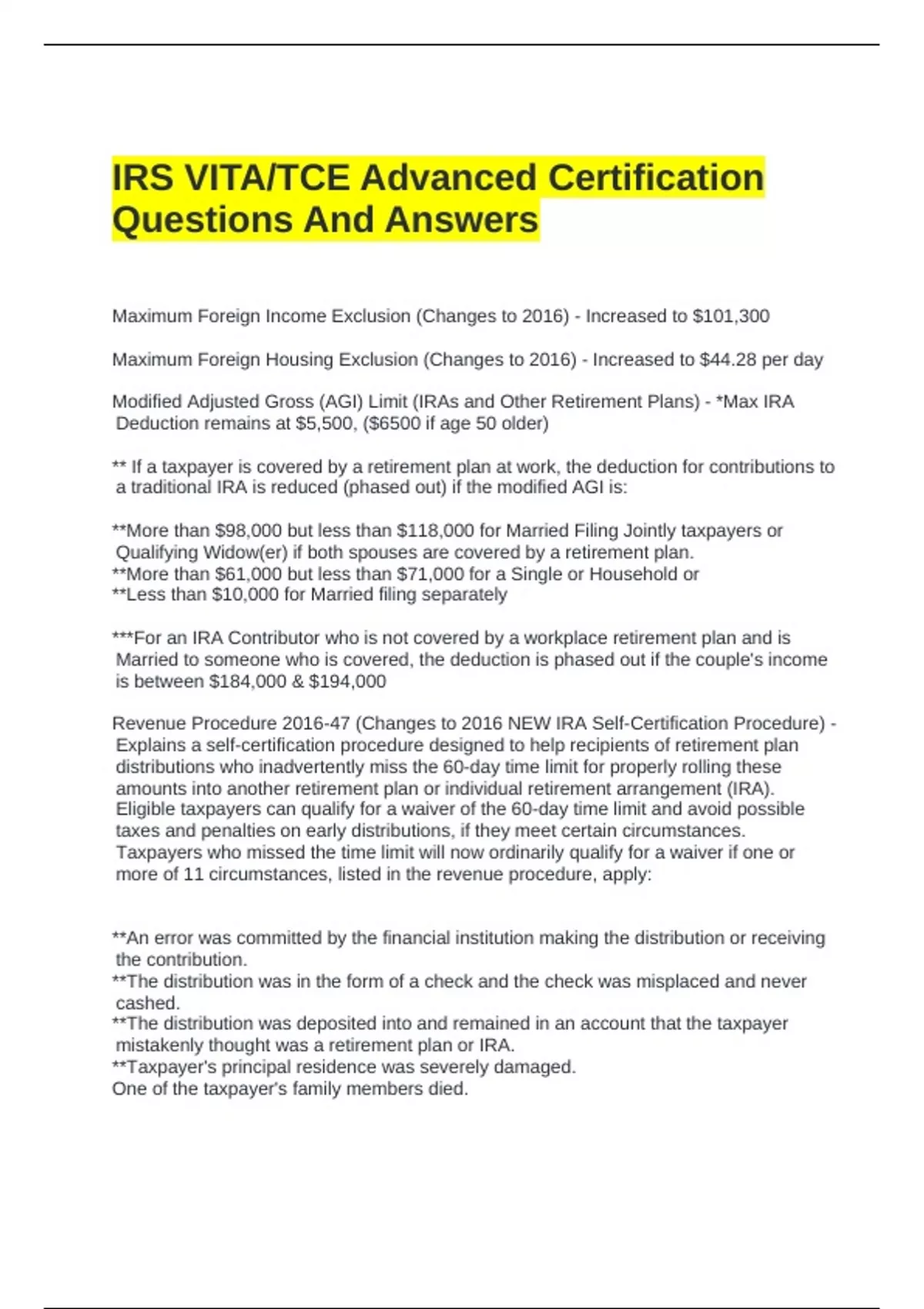 Revenue Procedure 2016-47 (Changes to 2016 NEW IRA Self-Certification Procedure) -