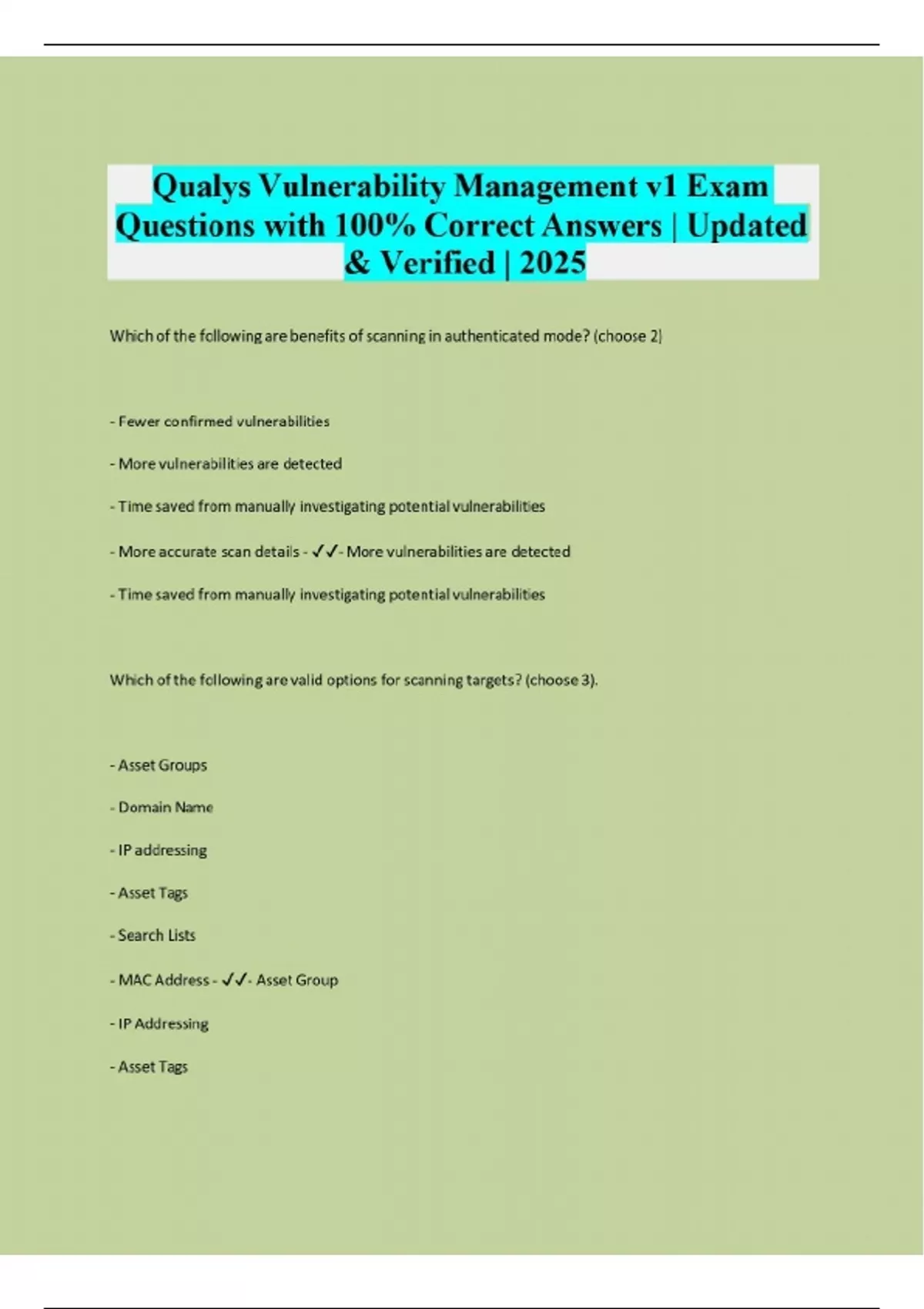 Qualys Vulnerability Management v1 Exam Questions with 100% Correct Answers | Updated & Verified | 2025
