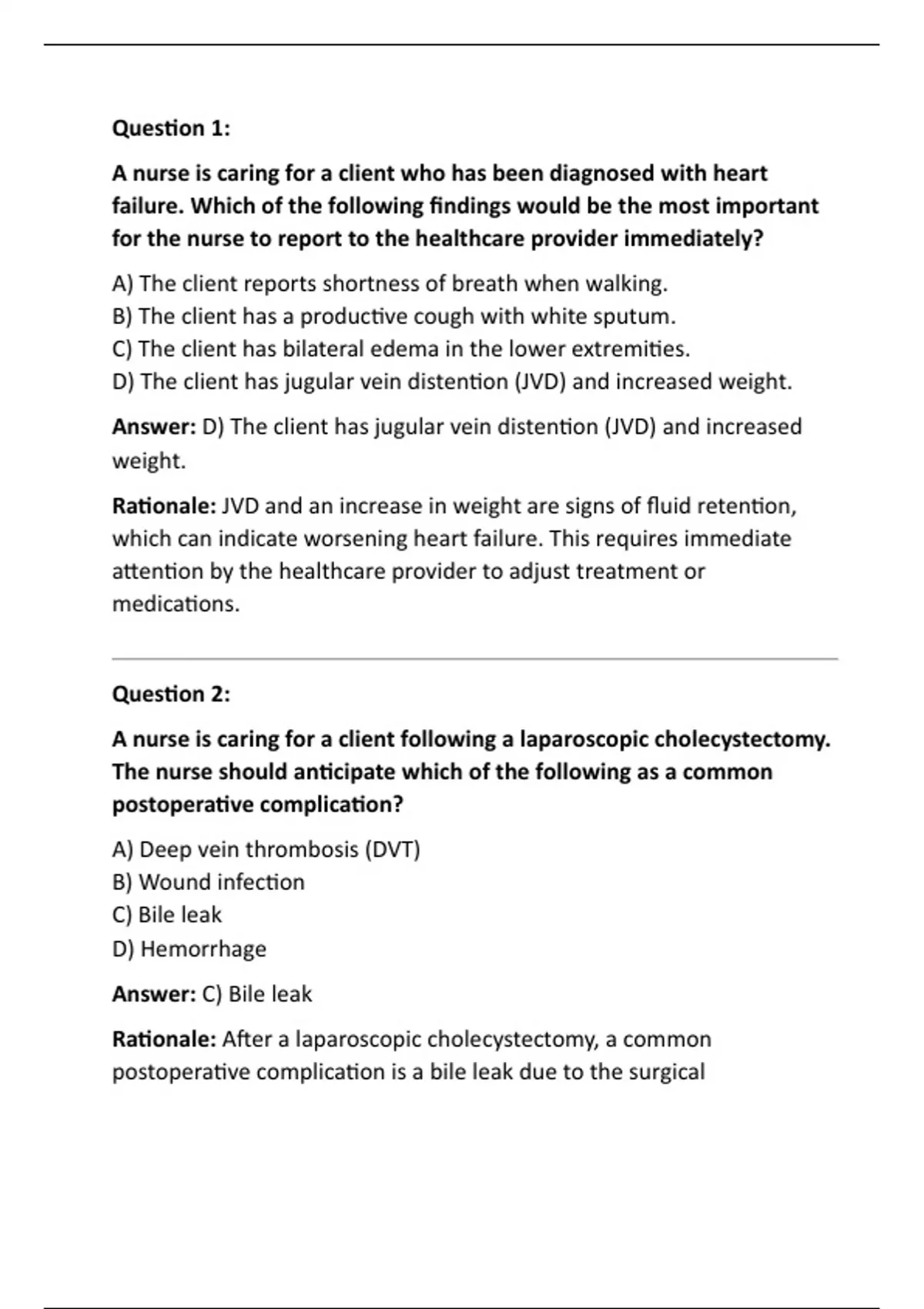 Answer: D) The client has jugular vein distention (JVD) and increased