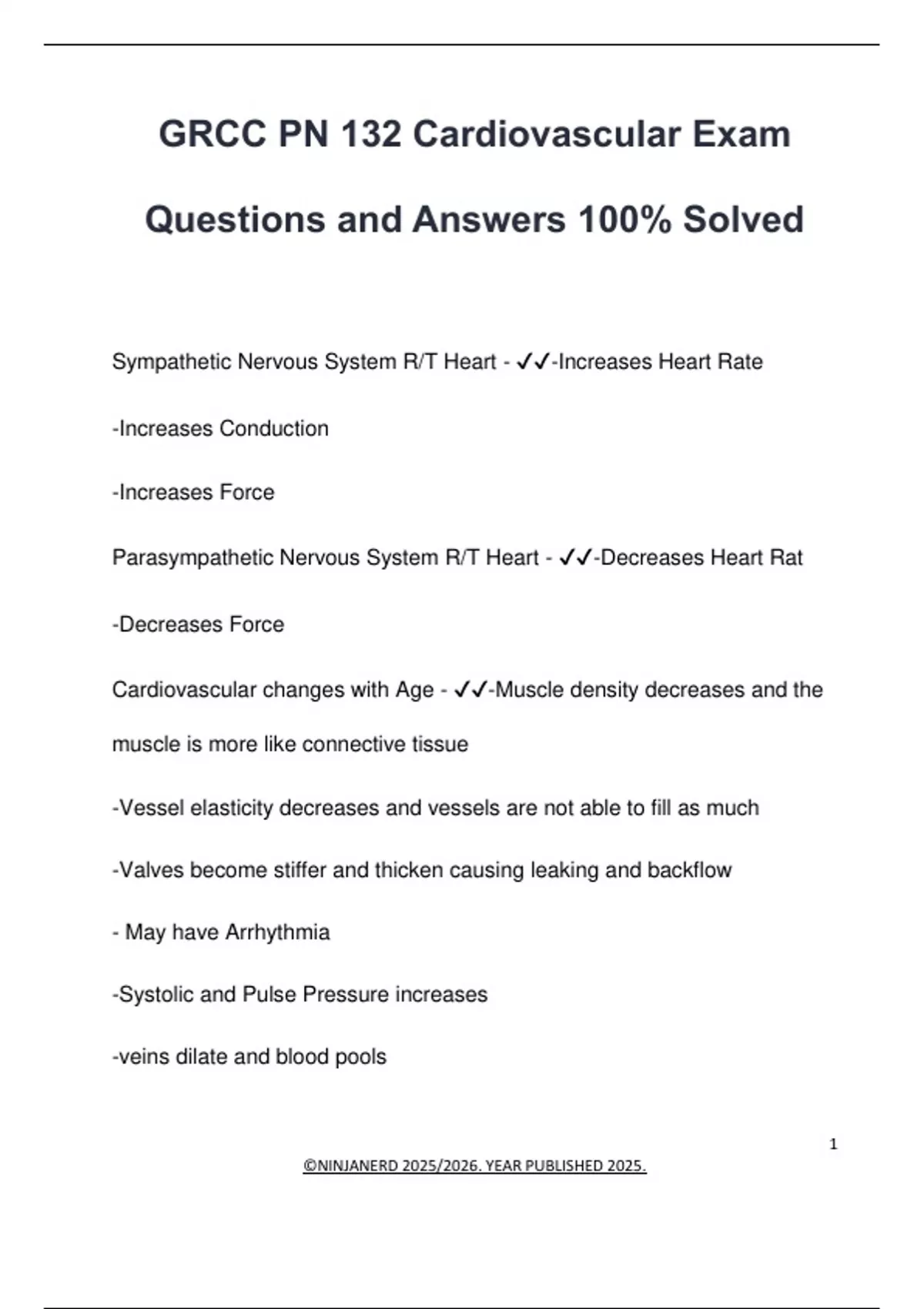 GRCC PN 132 Cardiovascular Exam Questions and Answers 100% Solved Sympathetic Nervous System R/T Heart - -Increases Heart Rate -Increases Conduction -Increases Force Parasympathetic Nervous System R/T Heart - -Decreases Heart Rat -Decreases Force Cardiovascular changes with Age - -Muscle density decreases and the muscle is more like connective tissue -Vessel elasticity decreases and vessels are not able to fill as much -Valves become stiffer and thicken causing leaking and backflow - May have Arrhythmia -Systolic and Pulse Pressure increases -veins dilate and blood pools