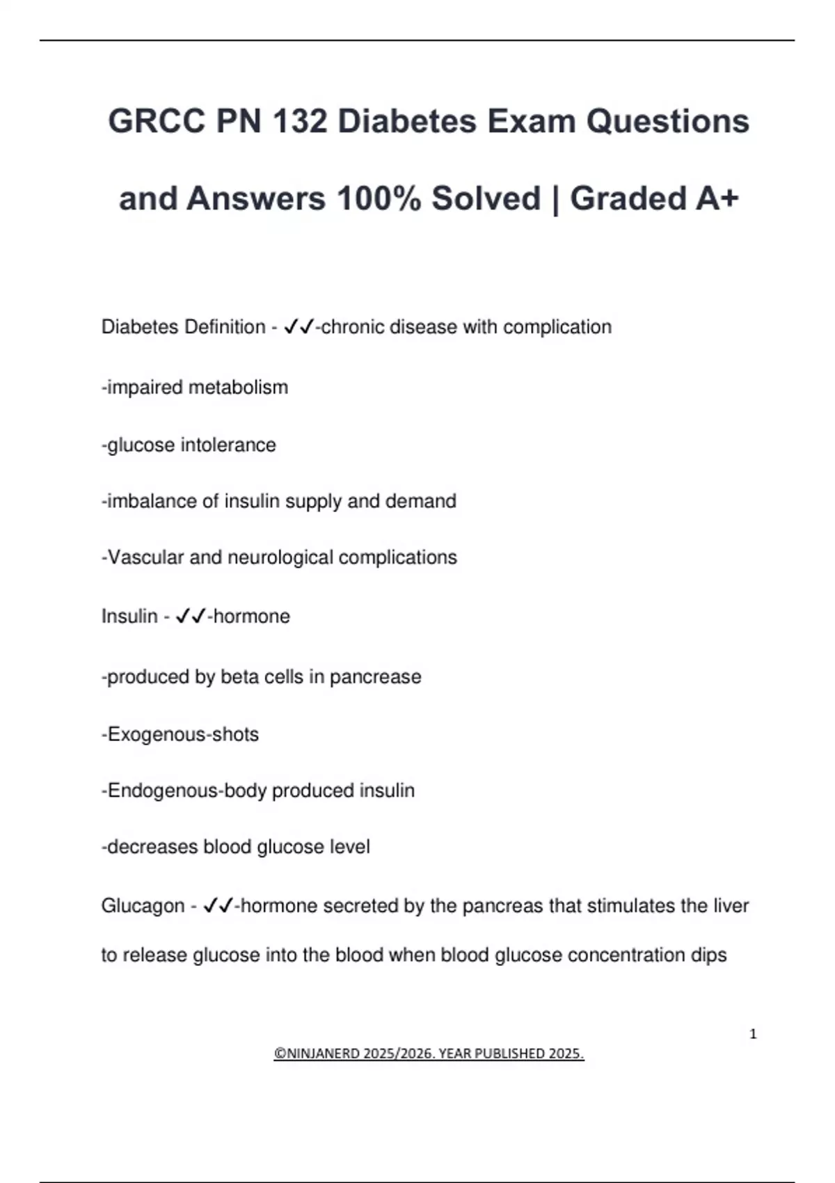 GRCC PN 132 Diabetes Exam Questions and Answers 100% Solved | Graded A+ Diabetes Definition - -chronic disease with complication -impaired metabolism -glucose intolerance -imbalance of insulin supply and demand -Vascular and neurological complications Insulin - -hormone -produced by beta cells in pancrease -Exogenous-shots -Endogenous-body produced insulin -decreases blood glucose level Glucagon - -hormone secreted by the pancreas that stimulates the liver to release glucose into the blood when blood glucose concentration dips