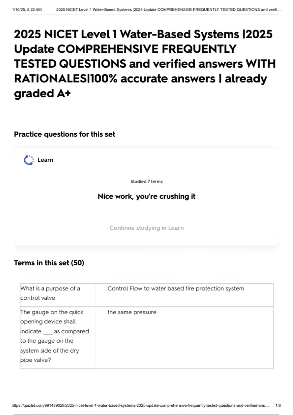 , 1/10/25, 8:22 AM 2025 NICET Level 1 Water-Based Systems |2025 Update COMPREHENSIVE FREQUENTLY TESTED QUESTIONS and verifi…