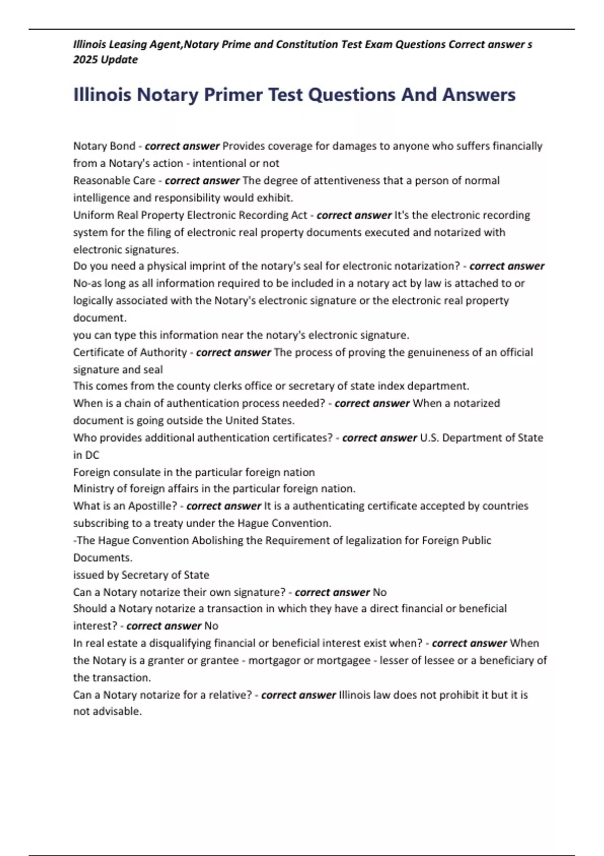 , Illinois Leasing Agent,Notary Prime and Constitution Test Exam Questions Correct answer s