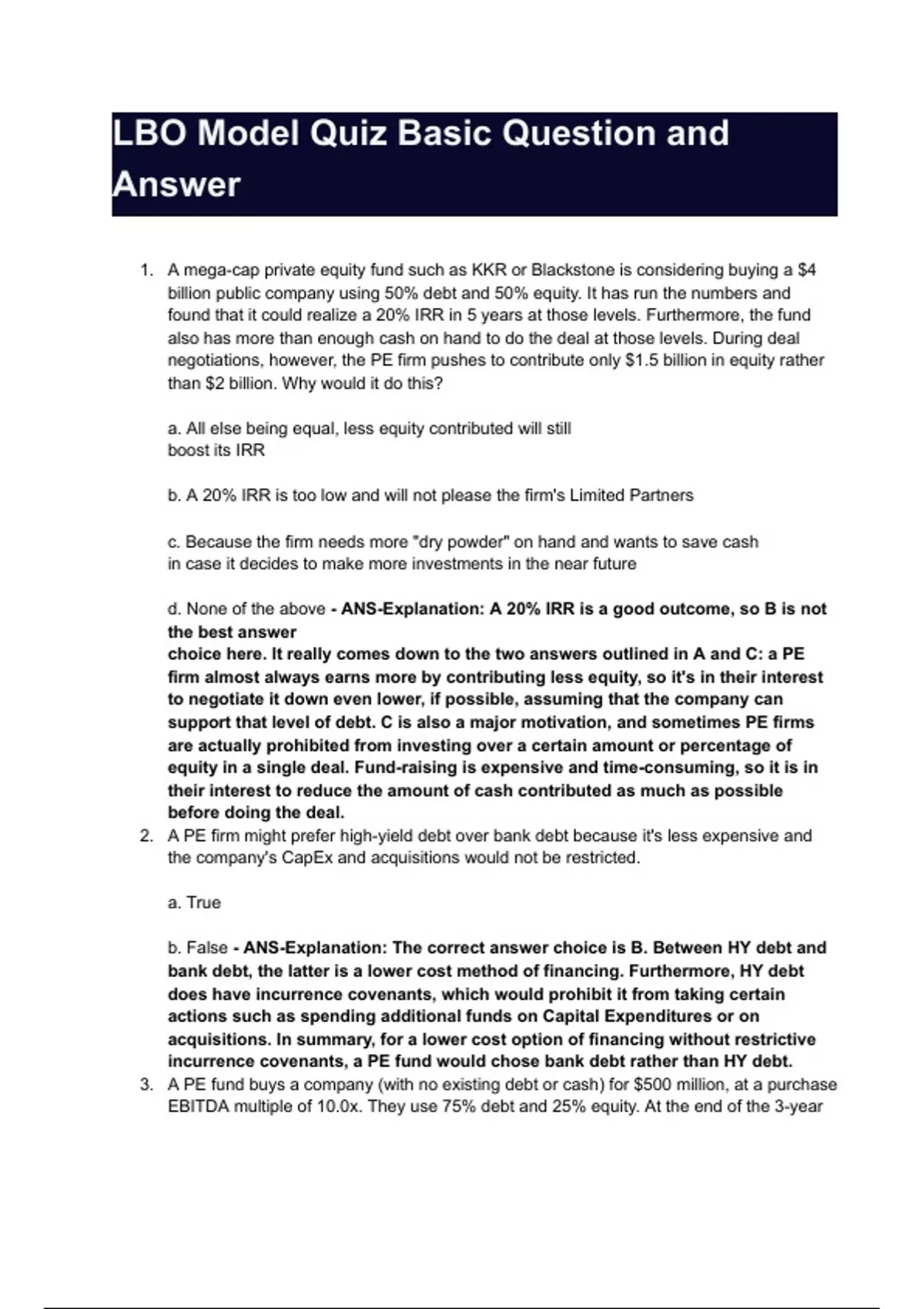 LBO Model Quiz Basic Question and