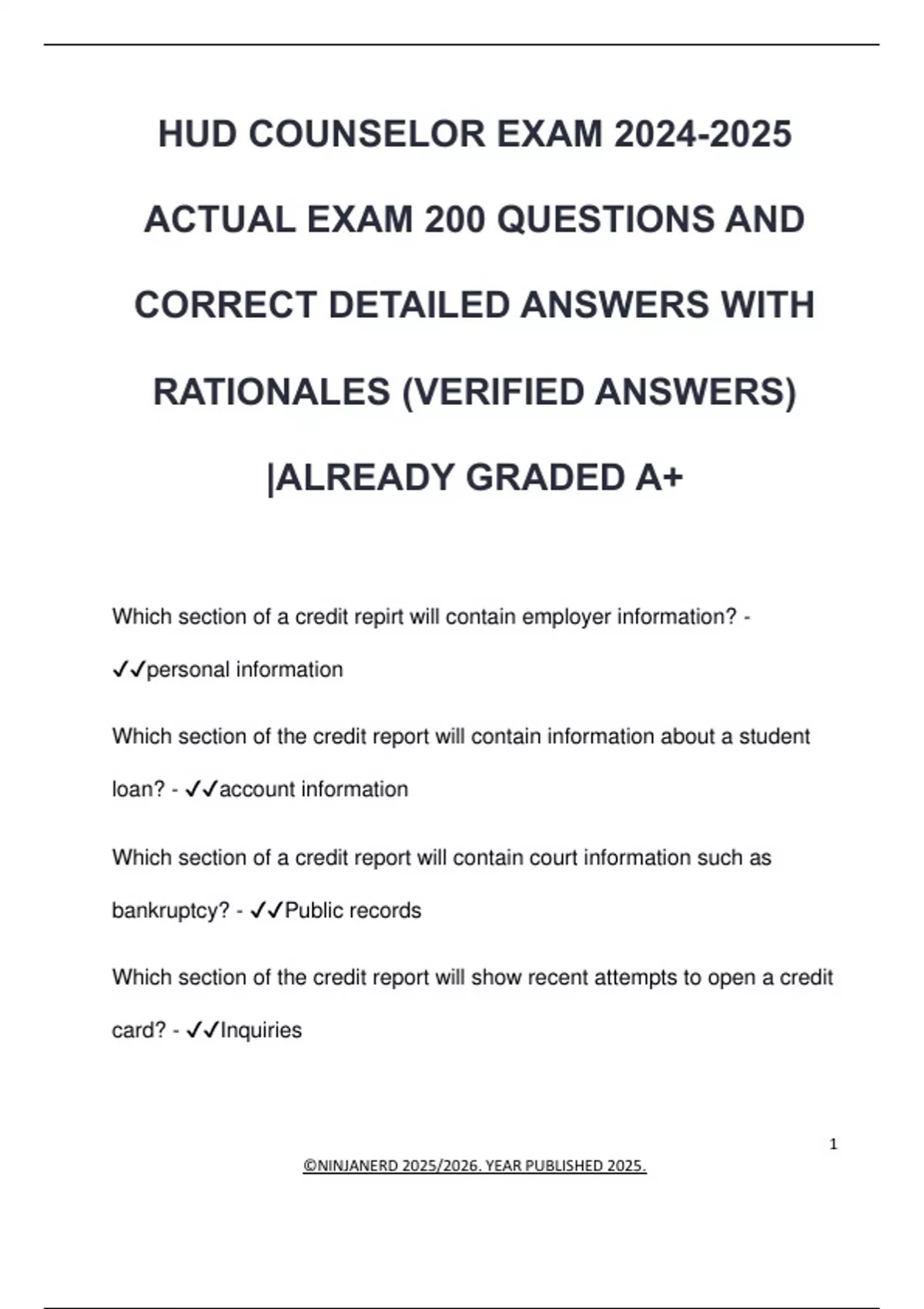 HUD COUNSELOR EXAM ACTUAL EXAM 200 QUESTIONS AND CORRECT DETAILED ANSWERS WITH RATIONALES (VERIFIED ANSWERS) |ALREADY GRADED A+ Which section of a credit repirt will contain employer information? - personal information Which section of the credit report will contain information about a student loan? - account information Which section of a credit report will contain court information such as bankruptcy? - Public records Which section of the credit report will show recent attempts to open a credit card? - Inquiries