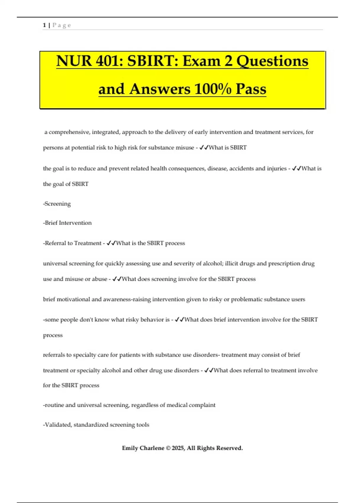 NUR 401: SBIRT: Exam 2 Questions and Answers 100% Pass a comprehensive, integrated, approach to the delivery of early intervention and treatment services, for persons at potential risk to high risk for substance misuse - What is SBIRT the goal is to reduce and prevent related health consequences, disease, accidents and injuries - What is the goal of SBIRT -Screening -Brief Intervention -Referral to Treatment - What is the SBIRT process universal screening for quickly assessing use and severity of alcohol; illicit drugs and prescription drug use and misuse or abuse - What does screening involve for the SBIRT process brief motivational and awareness-raising intervention given to risky or problematic substance users -some people don't know what risky behavior is - What does brief intervention involve for the SBIRT process referrals to specialty care for patients with substance use disorders- treatment may consist of brief treatment or specialty alcohol and other drug use disorders - What does referral to treatment involve for the SBIRT process -routine and universal screening, regardless of medical complaint -Validated, standardized screening tools 2 | P a g e Emily Charlene © 2025, All Rights Reserved. -alcohol use seen in a continuum -evidenced-based, patient-centered change talk -ongoing transition between primary care and treatment - When SBIRT is implemented what does it allow for patients -inconsistent and selective screening -non-systematized narrative questions -alcohol use seen as dichotomous -ineffective, directive style of communication -discordination, unclear referrals and follow-up - If the SBIRT is not implemented what does that mean for the patient -All RNs in all settings should be prepared to deliver SBIRT -Hospitals should invest this training -RN's should be involved in SBIRT research -ALl levels of nursing curricula should include SBIRT training - What are the expanded roles and responsibilities for RN's using SBIRT -screen all patients >/= 18 years for alcohol use -offer brief interventions for positive screens -provide alcohol and other drug use disorder treatment at discharge -assess status after discharge - What does the joint commission sa