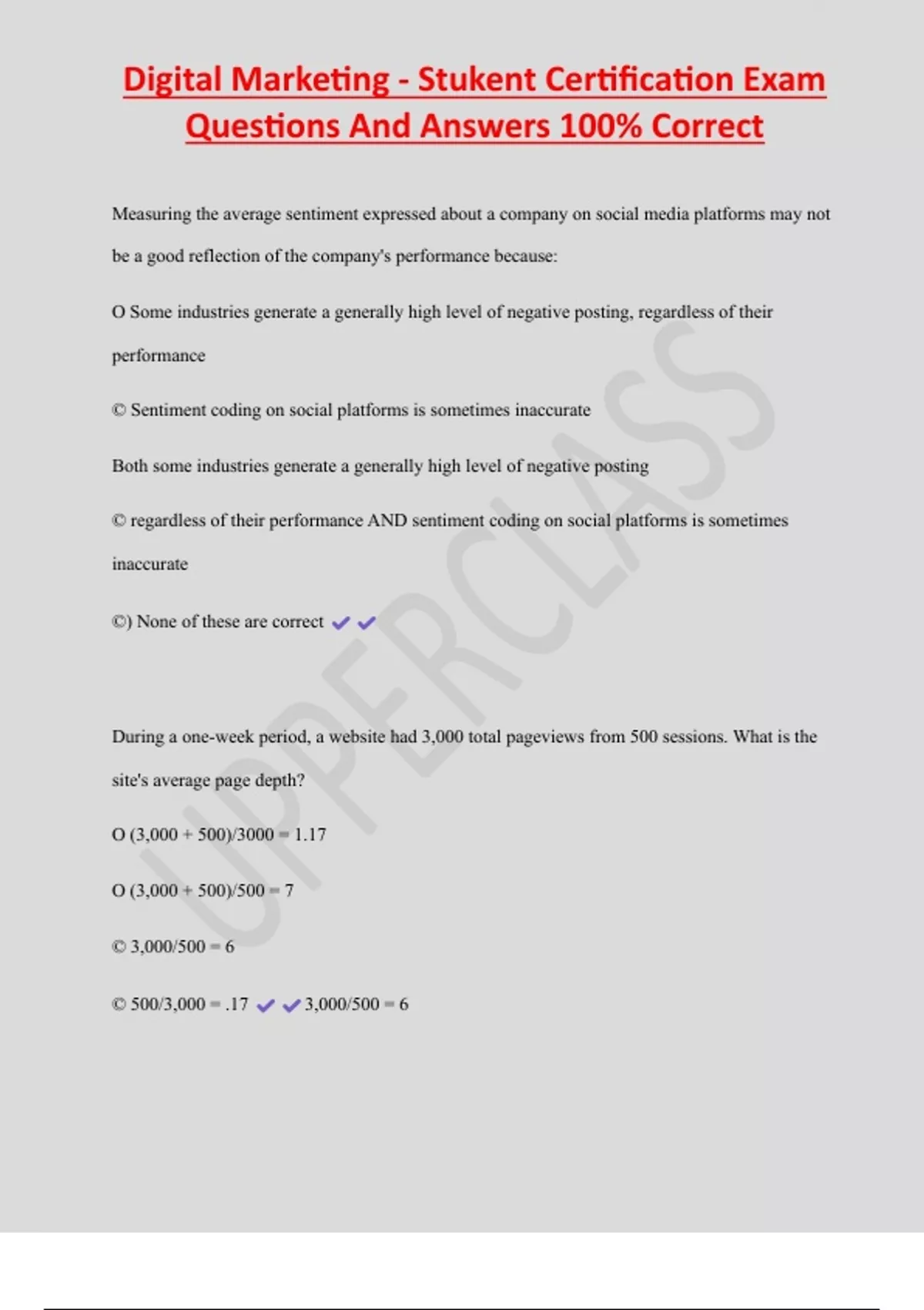 Digital Marketing - Stukent Certification Exam Questions And Answers 100% Correct Measuring the average sentiment expressed about a company on social media platforms may not be a good reflection of the company's performance because: O Some industries generate a generally high level of negative posting, regardless of their performance © Sentiment coding on social platforms is sometimes inaccurate Both some industries generate a generally high level of negative posting © regardless of their performance AND sentiment coding on social platforms is sometimes inaccurate ©) None of these are correct