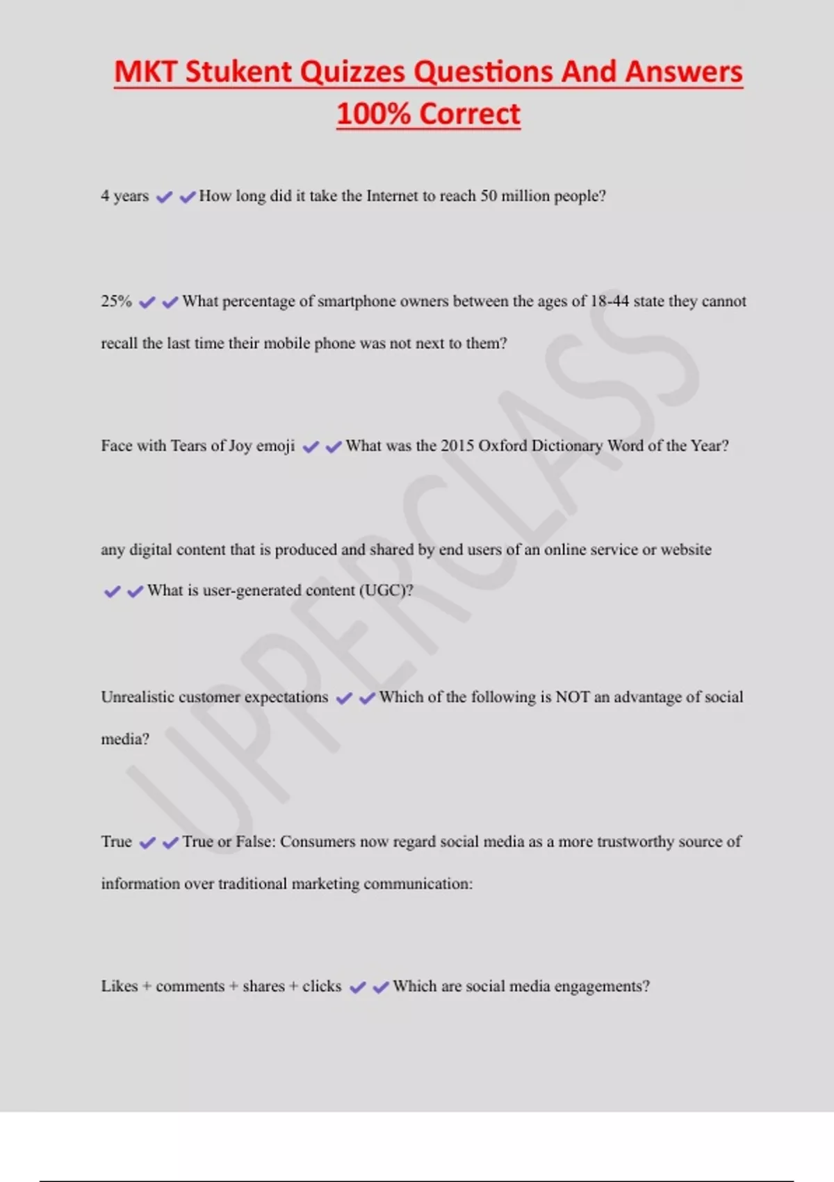 MKT Stukent Quizzes Questions And Answers 100% Correct 4 years How long did it take the Internet to reach 50 million people? 25% What percentage of smartphone owners between the ages of 18-44 state they cannot recall the last time their mobile phone was not next to them? Face with Tears of Joy emoji What was the 2015 Oxford Dictionary Word of the Year? any digital content that is produced and shared by end users of an online service or website What is user-generated content (UGC)? Unrealistic customer expectations Which of the following is NOT an advantage of social media?