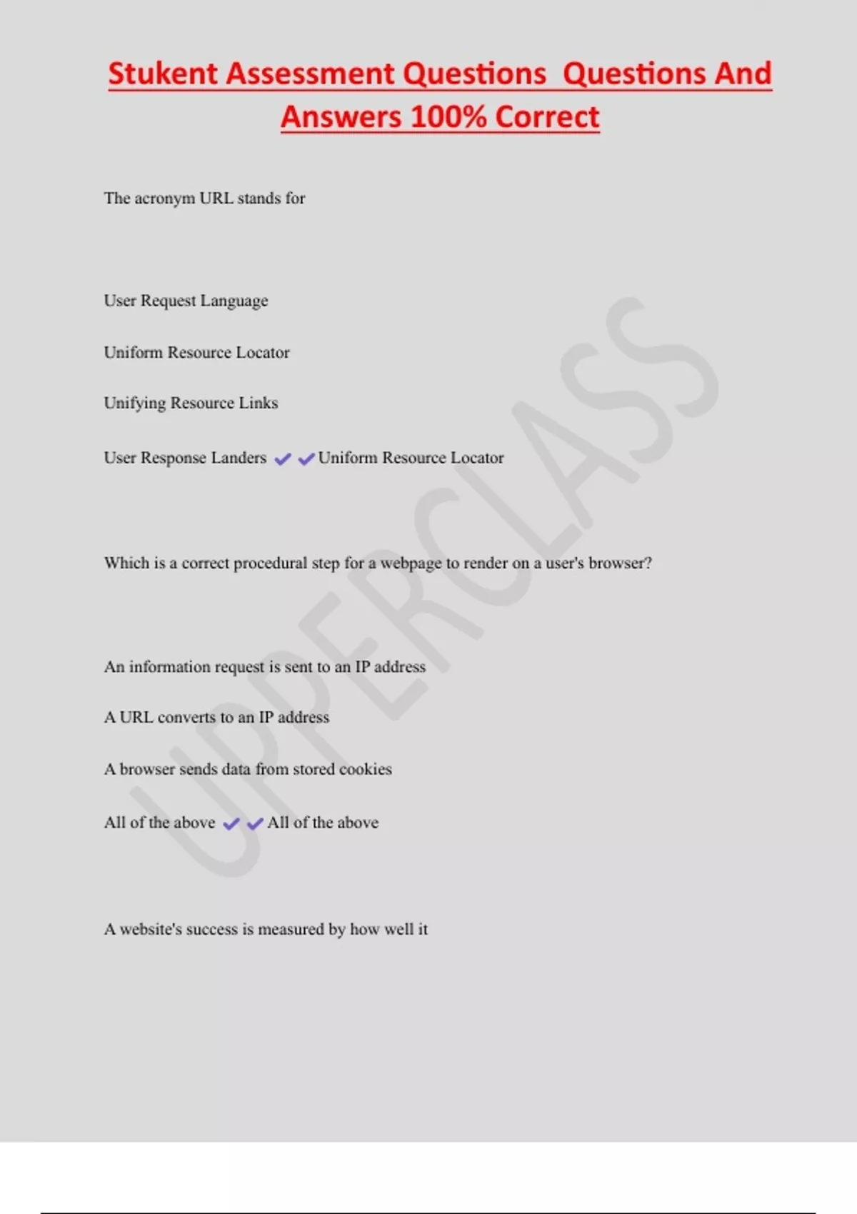 Stukent Assessment Questions Questions And Answers 100% Correct The acronym URL stands for User Request Language Uniform Resource Locator Unifying Resource Links User Response Landers Uniform Resource Locator Which is a correct procedural step for a webpage to render on a user's browser? An information request is sent to an IP address A URL converts to an IP address A browser sends data from stored cookies All of the above All of the above