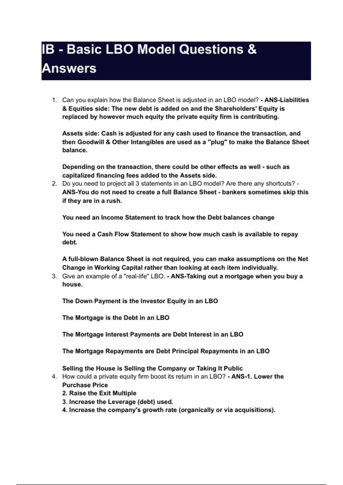 IB - Basic LBO Model Questions & Answers