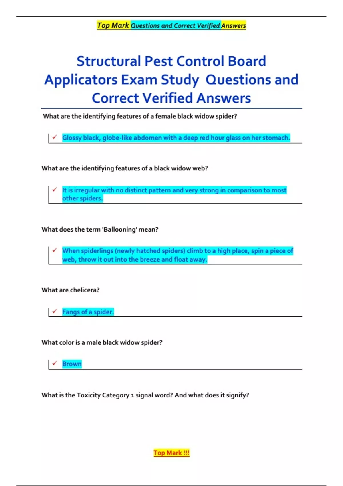 Structural Pest Control Board Applicators Exam Study Questions and Correct Verified Answers