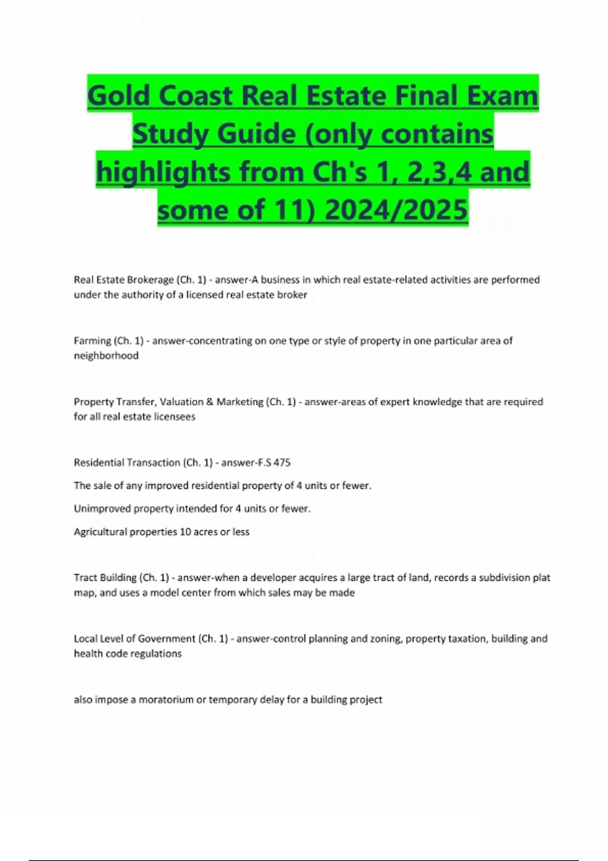 Gold Coast Real Estate Final Exam Study Guide (only contains highlights from Ch's 1, 2,3,4 and some of 11) 2024/2025