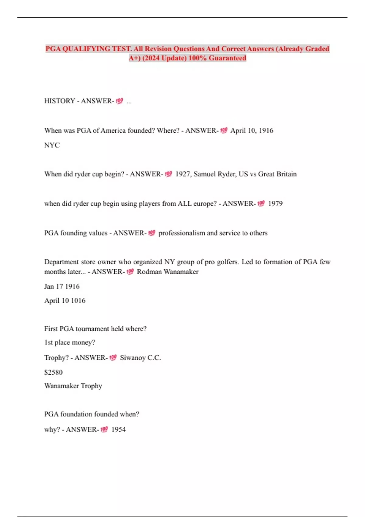 PGA QUALIFYING TEST. All Revision Questions And Correct Answers (Already Graded